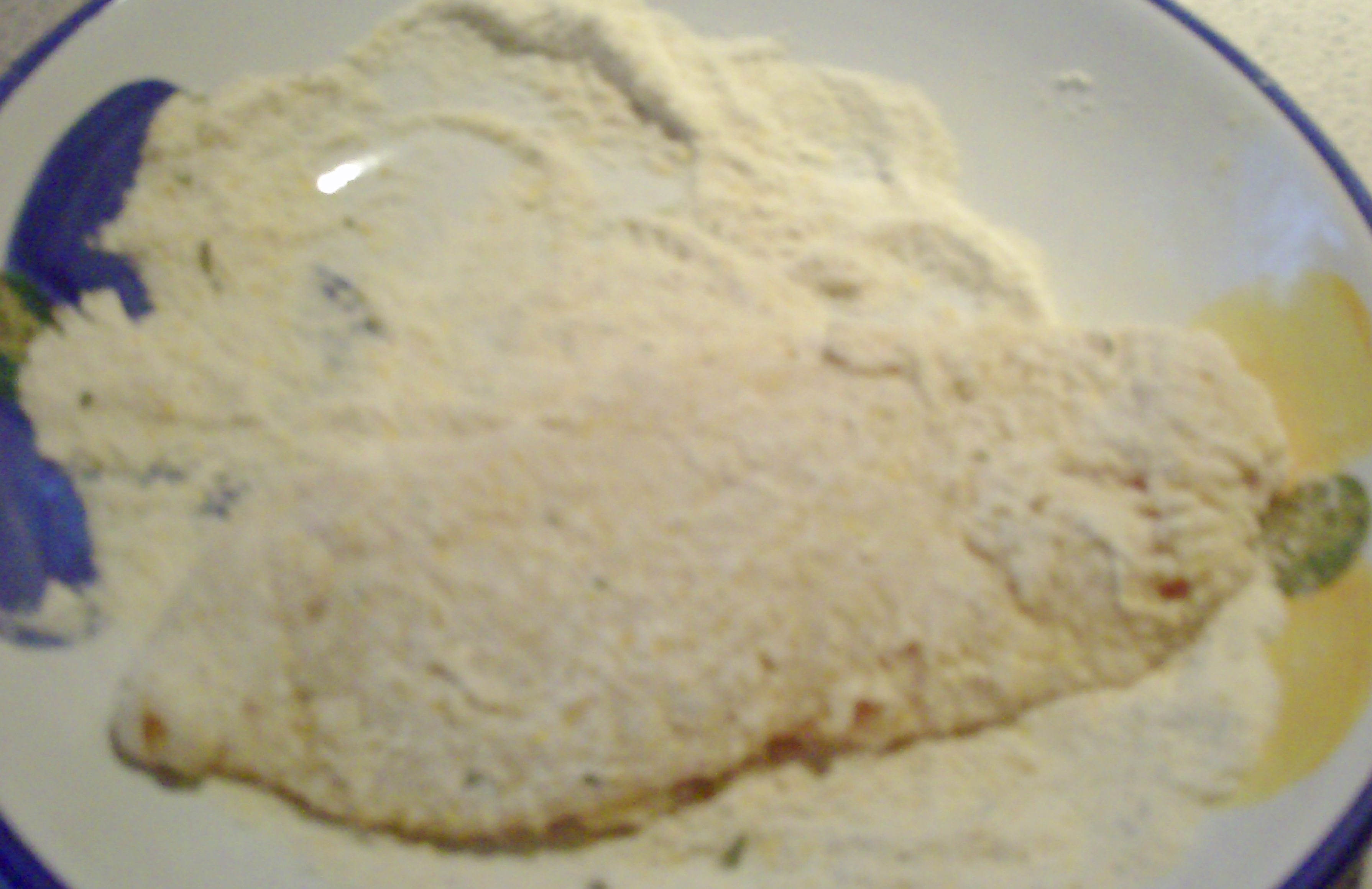 Chicken cutlets dredged in ‘bread’crumb and fried in a thin coating of oil is common in many households. Chicken cutlets prepared in this way are the base for chicken cutlet parmigiana. They are delicious hot or room temperature. Leftovers make yummy sandwiches or sliced in salad for lunch the next day. This recipe uses Masa Harina (super finely ground corn flour) with the crunchiness of Polenta (coarse corn meal). The two textures combine to form a crisp coating.
