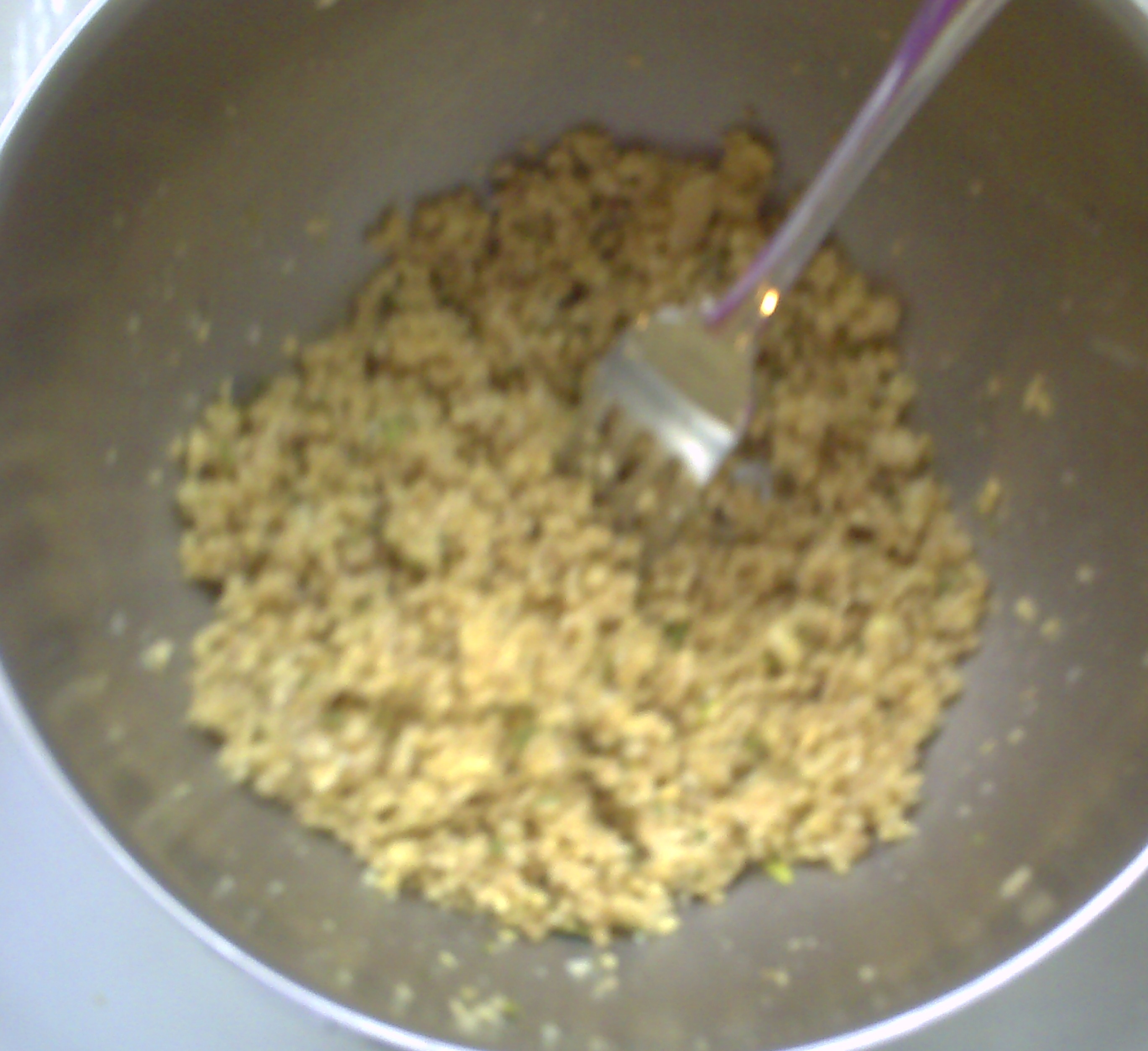 - Add the mushroom stem & garlic mixture to ‘breadcrumb’ mixture. Toss with fork until well combined.
