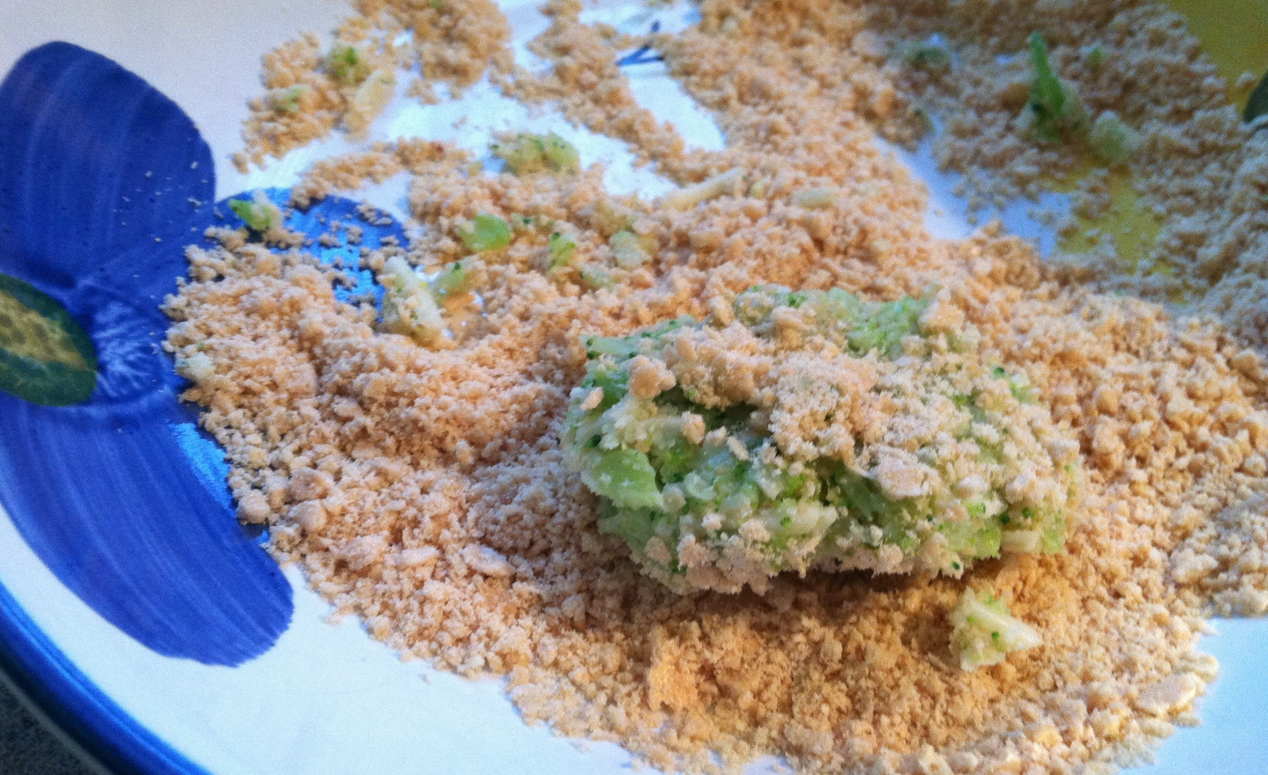Prepare the Broccoli: Defrost, chop finely or process in food processor. Squeeze out excess liquid. Using hands or large fork, combine in shredded cheese and egg white. Then add reserved ‘breadcrumb’ mixture. Thoroughly combine with hands. The final mixture should feel damp NOT wet. If too wet, add more ‘breadcrumb’.