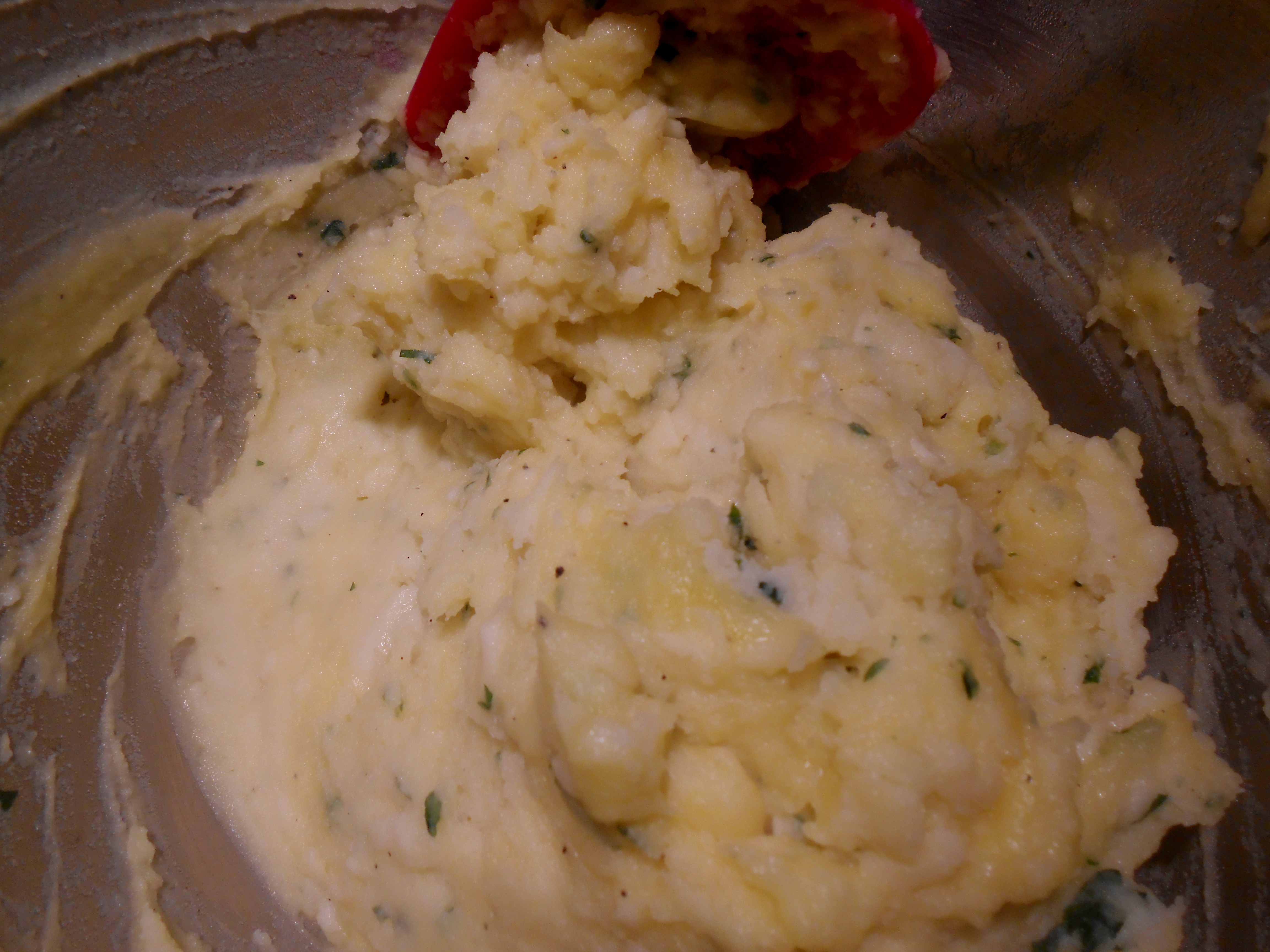 Once drained, mash the potatoes. Use whichever tool is comfortable to accomplish this, I use a stand mixer. Fold in butter, then garlic, then parsley, then cheese and salt and pepper to taste. Place mixture aside and cool completely.