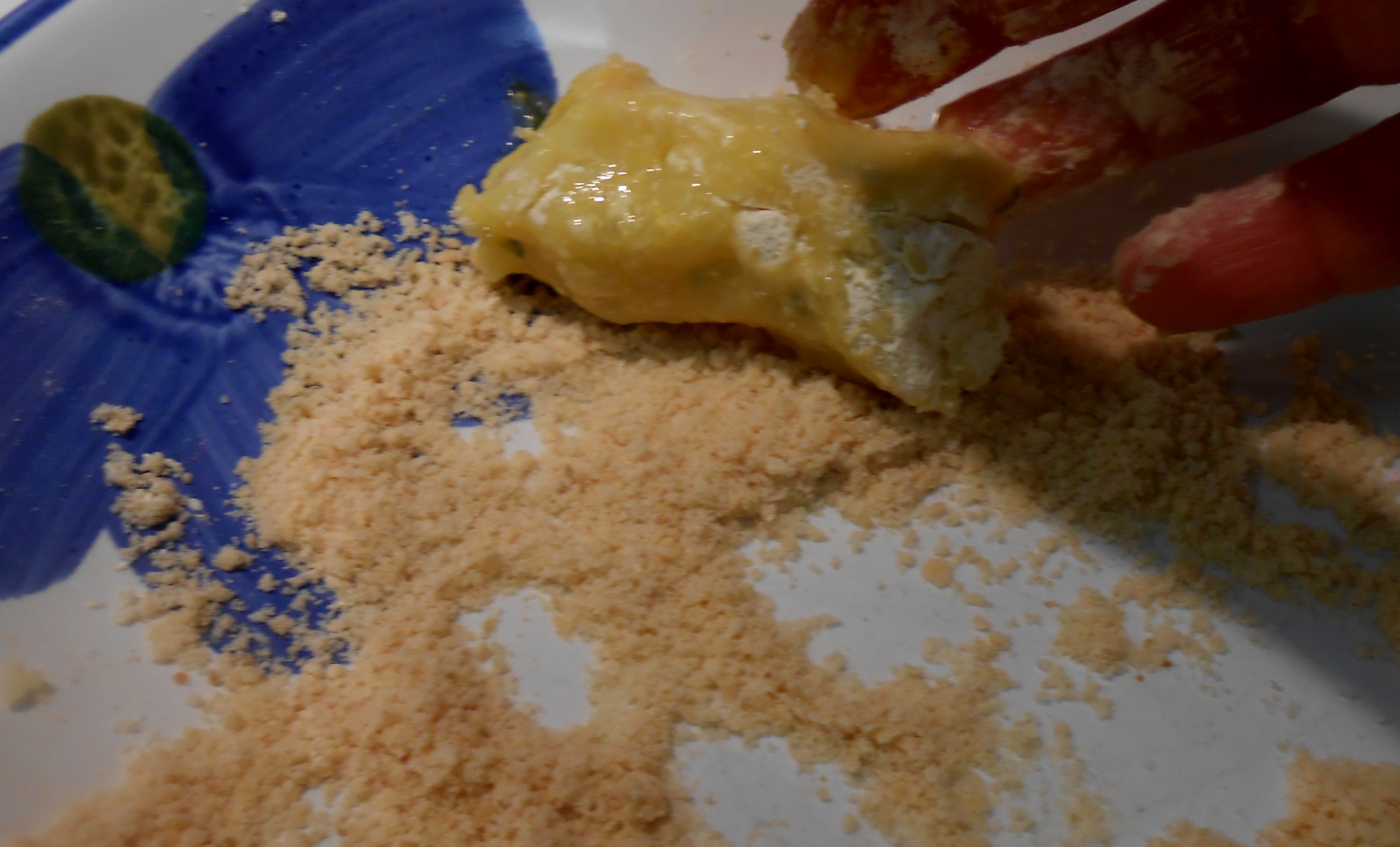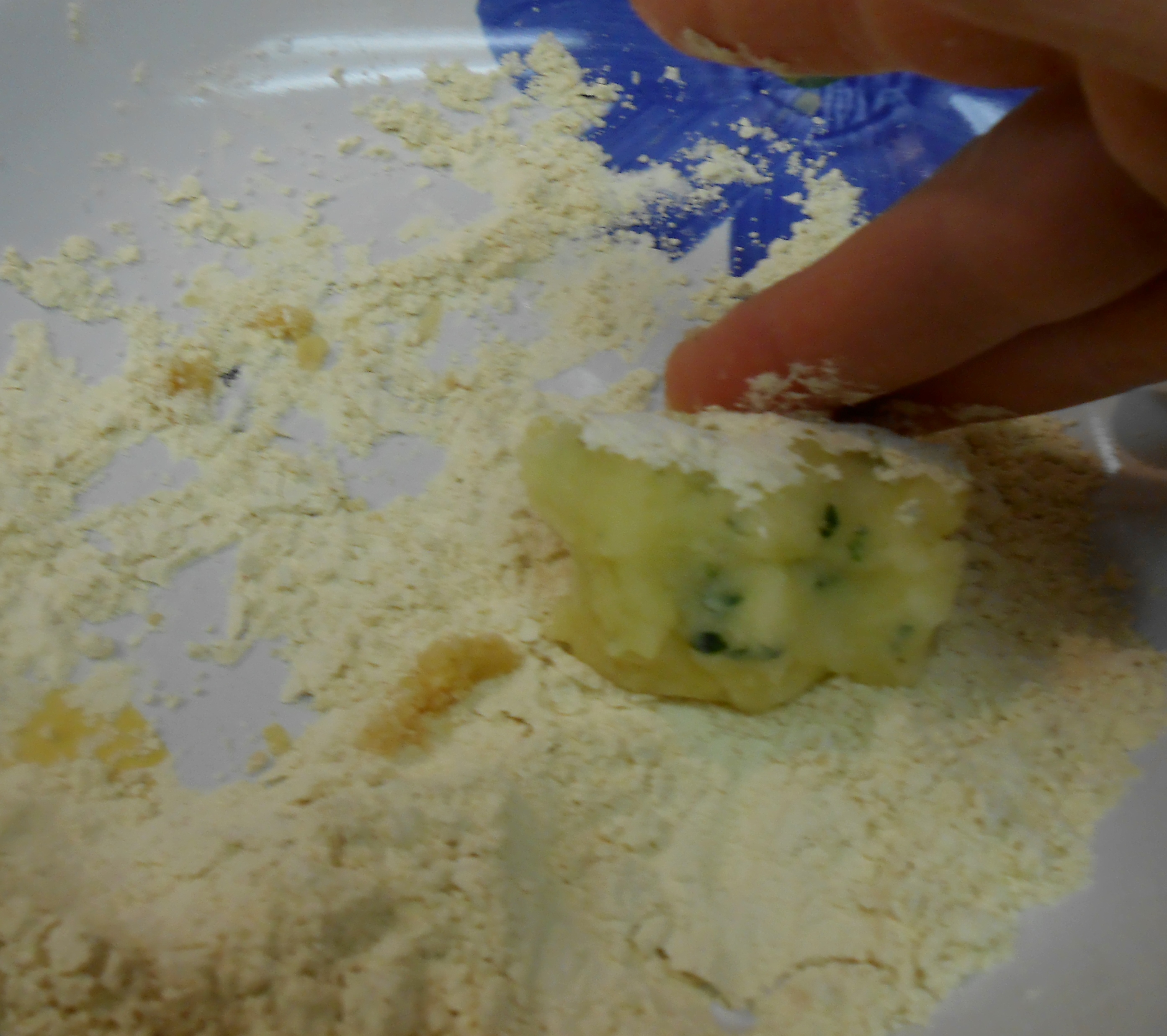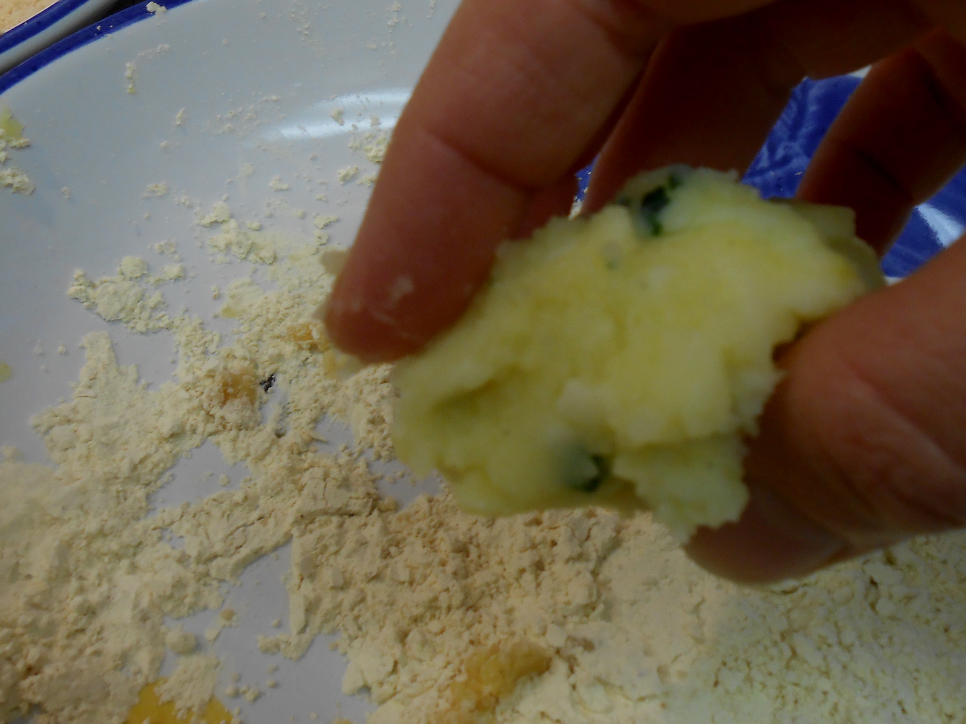 I line the bowls up in the following order: potato mixture, ceci flour bowl for dusting, egg bowl and breadcrumb bowl.