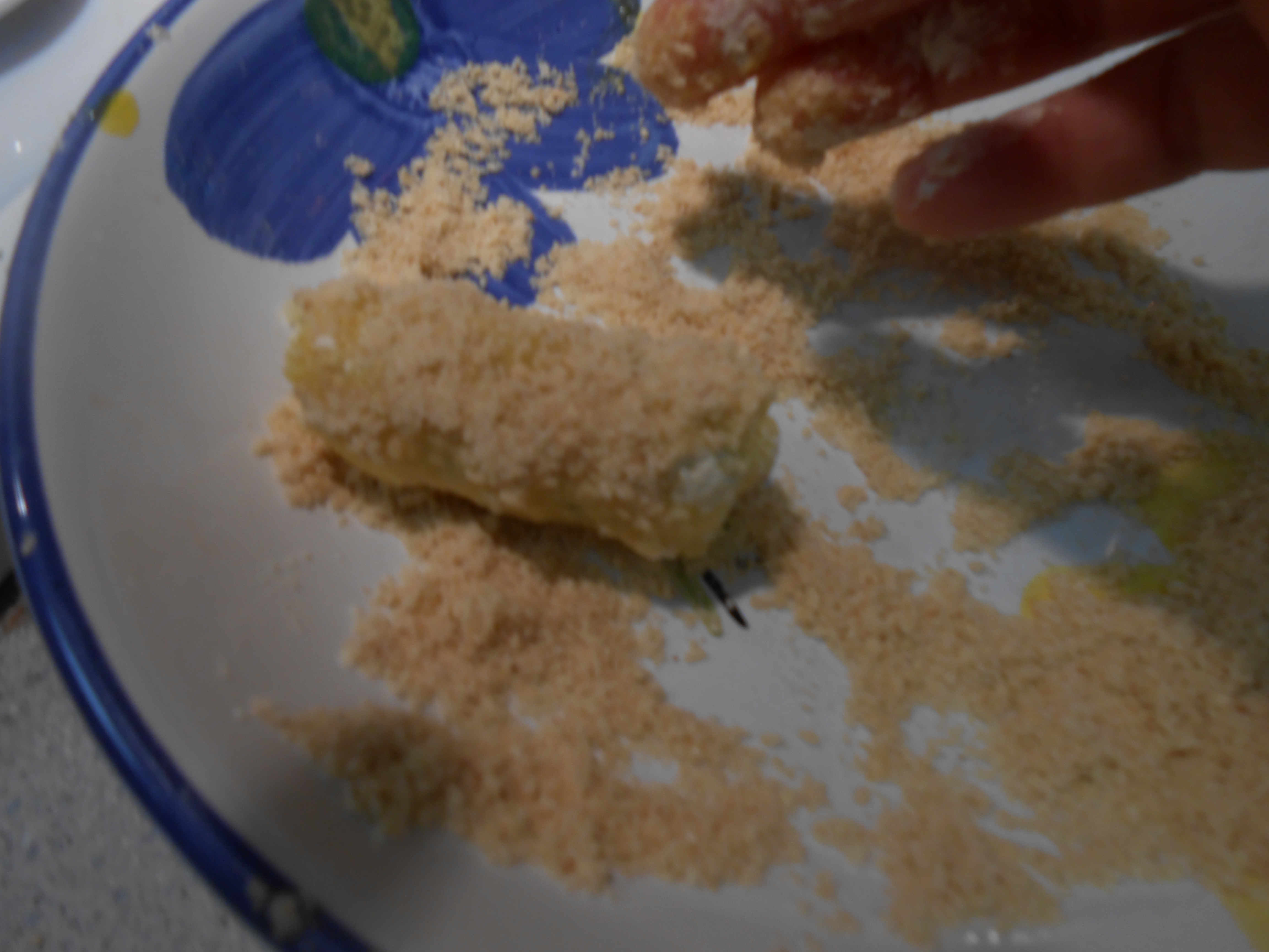 From the potato mixture, pluck a clump about 1 ½ – 2 inches in girth. Using a swift rolling action: roll into barrel shape. Quickly use your fingers to push/roll the mixture in flour to add a dusting layer to the barrel. Again, using quick motions, dunk in egg – rolling the barrel swiftly toward you; then quickly plunge in breadcrumb bowl – all the while swiftly rolling the barrel toward you. If you are not swift, the egg mixture will be the most challenging. If the potato mixture is too wet, fold in breadcrumb or ceci flour – about one tablespoon at a time until mixture is thick enough to handle.
