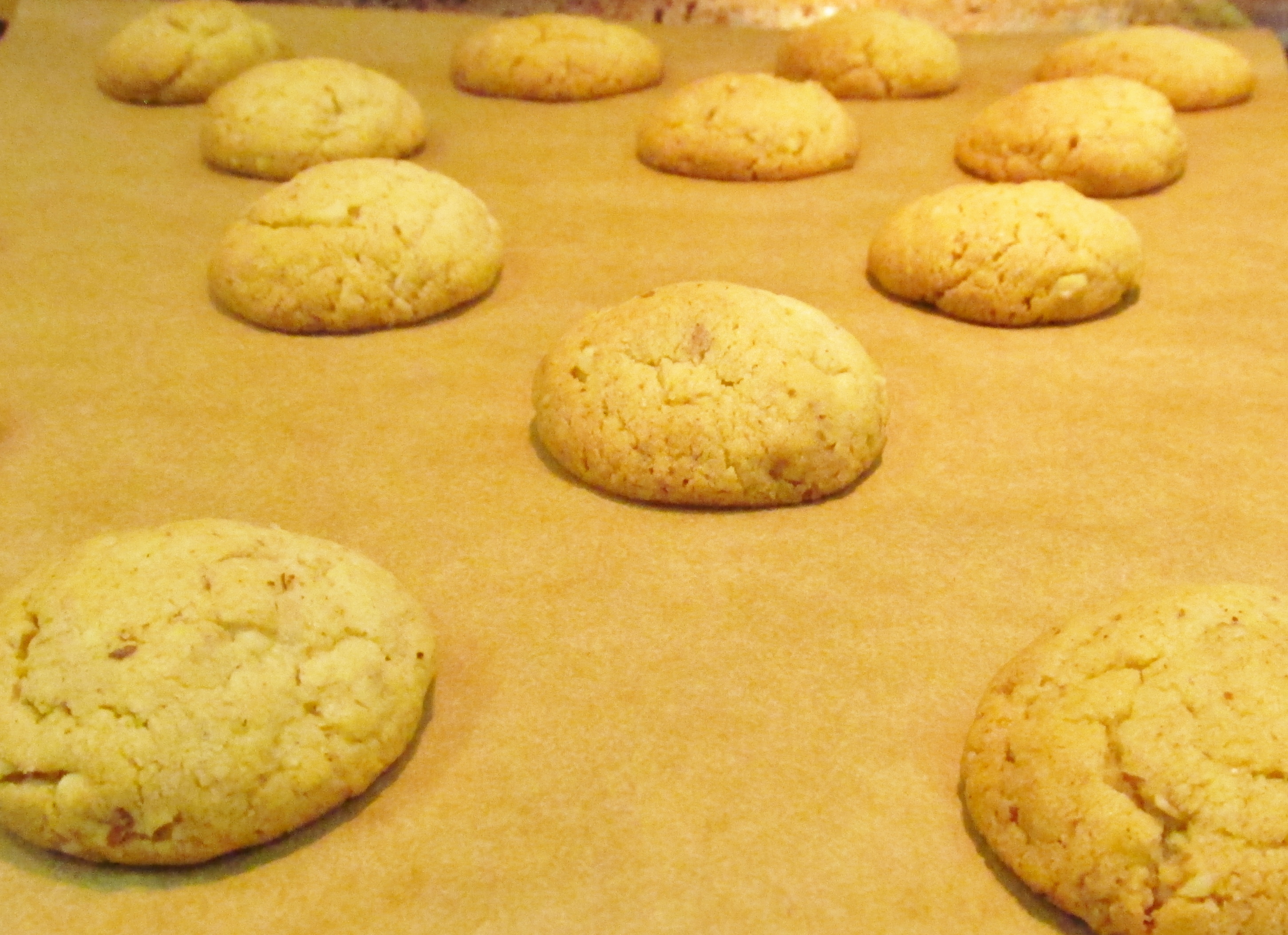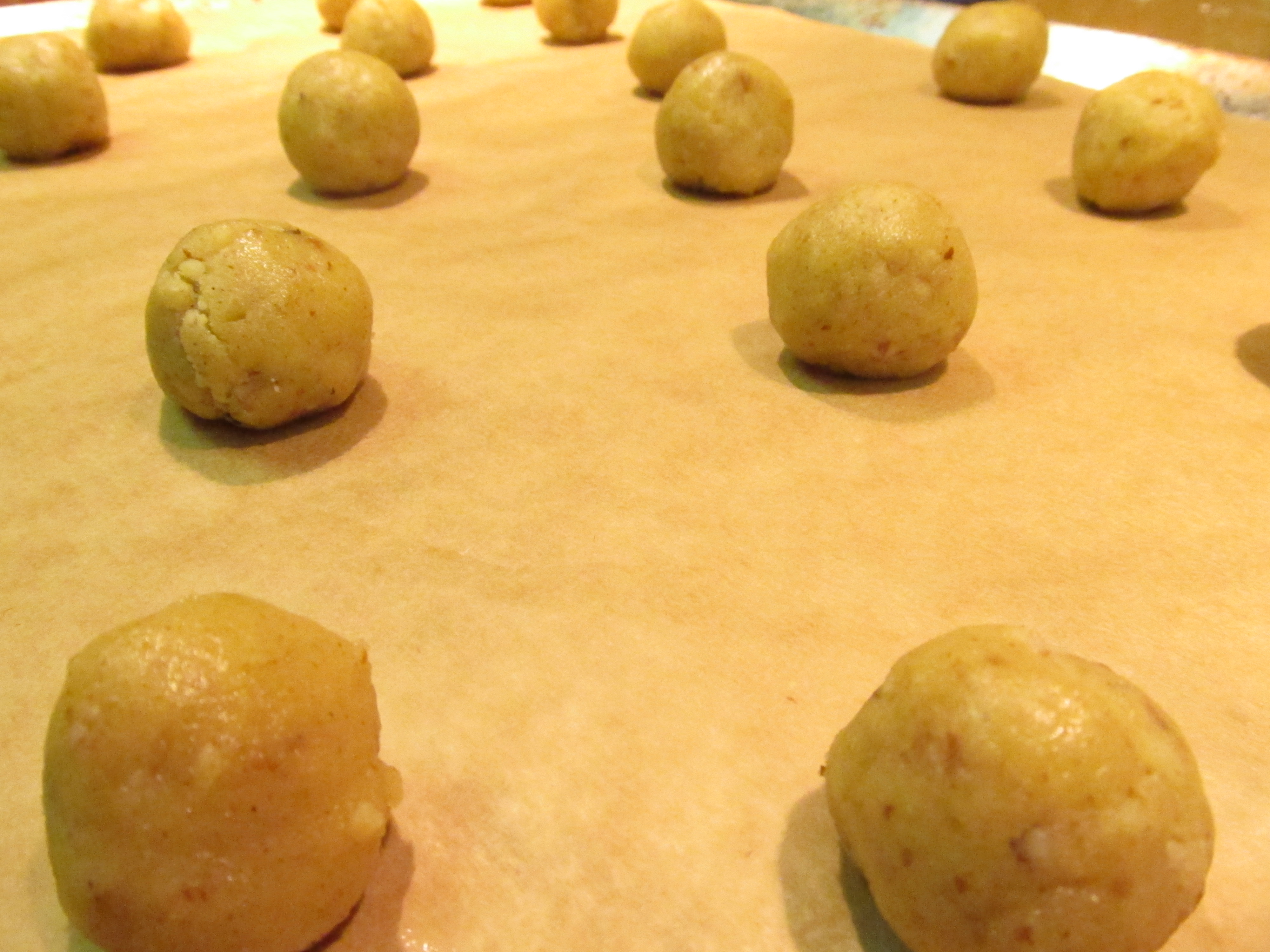 On a parchment paper lined cookie sheet, line up the dough balls approximately 2 ½ inches apart. Flatten each ball slightly with center of palm to help cookie bake in a uniform roundness.