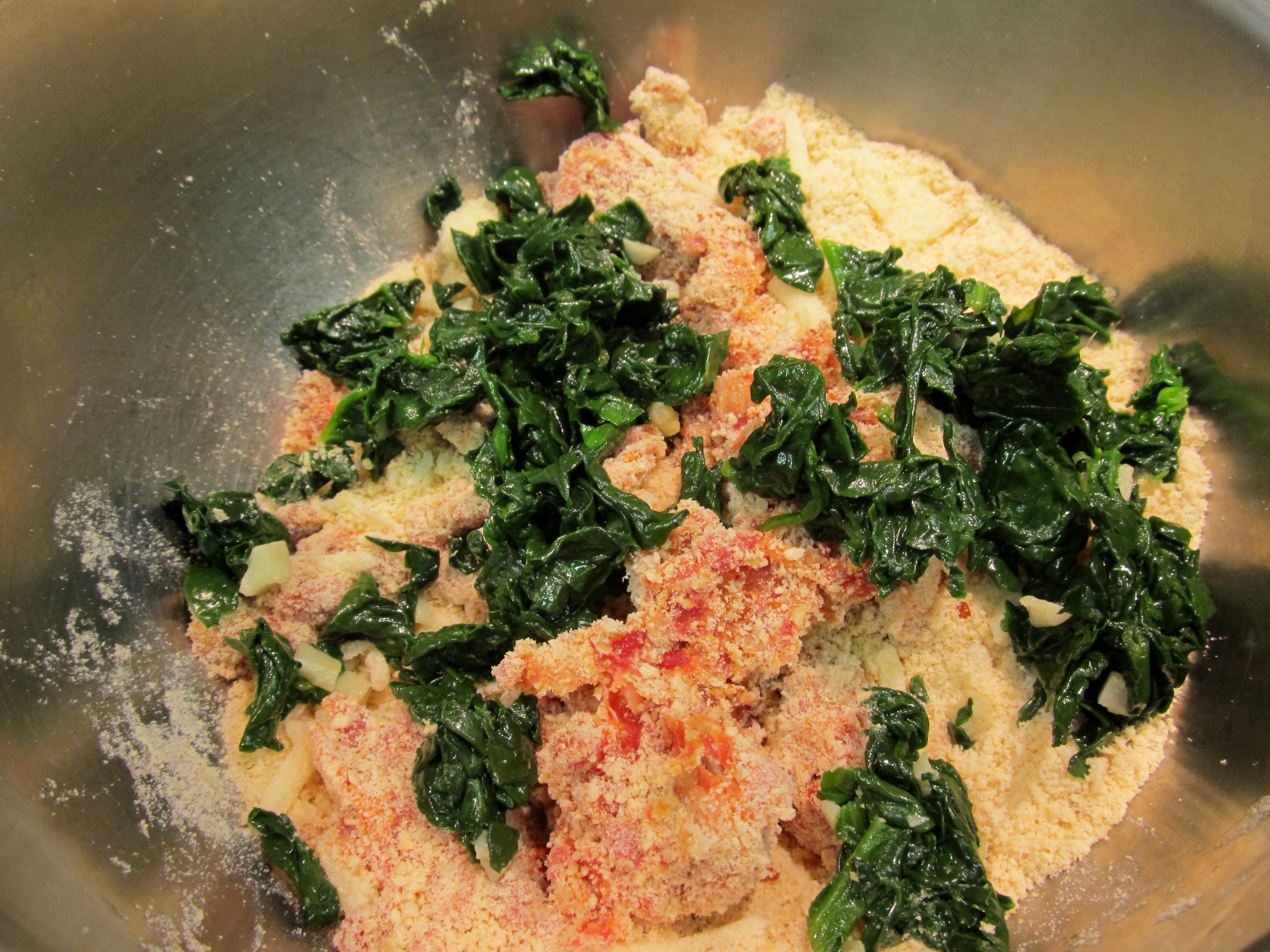 Add shredded cheese to mixture, combine with fork or hand. Remove casing from sausage. Slice sausage lengthwise with a sharp knife, use knife to lift skin. Crumble sausage into mixture and combine with hand. Add chopped spinach, combine with hand. Add egg, combine with hands until the mixture becomes more of a ball.