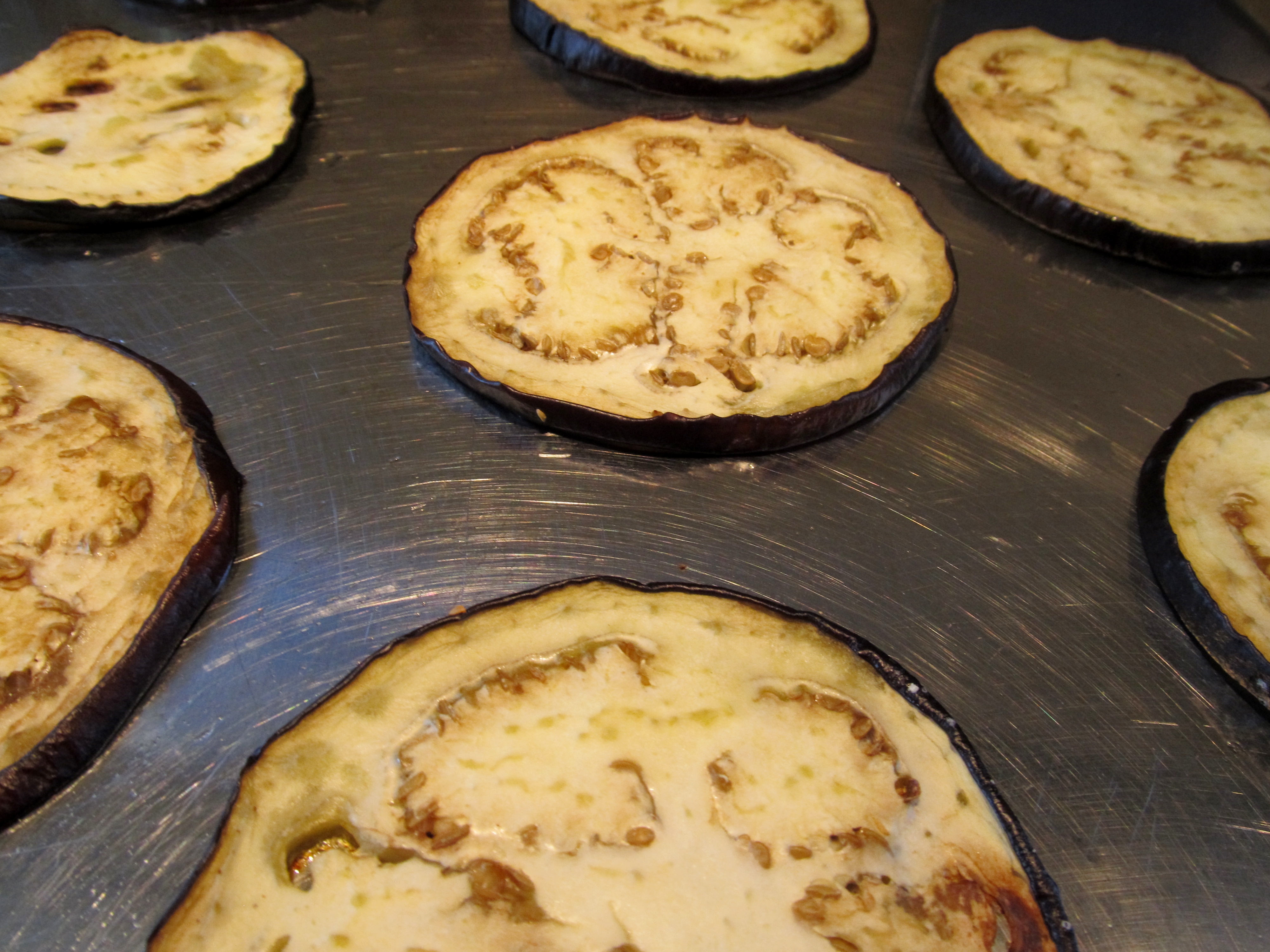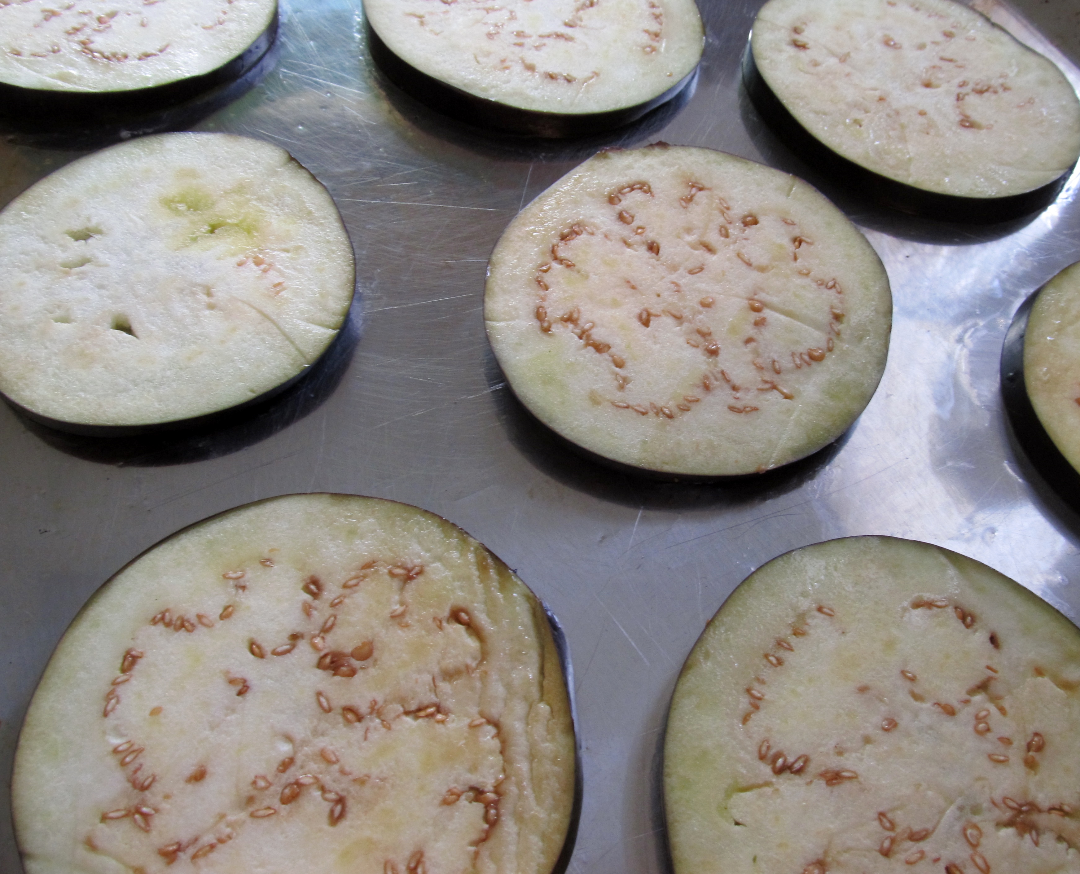 Pre-heat oven to 375 degrees. Cut eggplant into ¼ inch slices. If using Globe Eggplant, press it first to remove bitters. Click here for instructions for Pressing Eggplant.