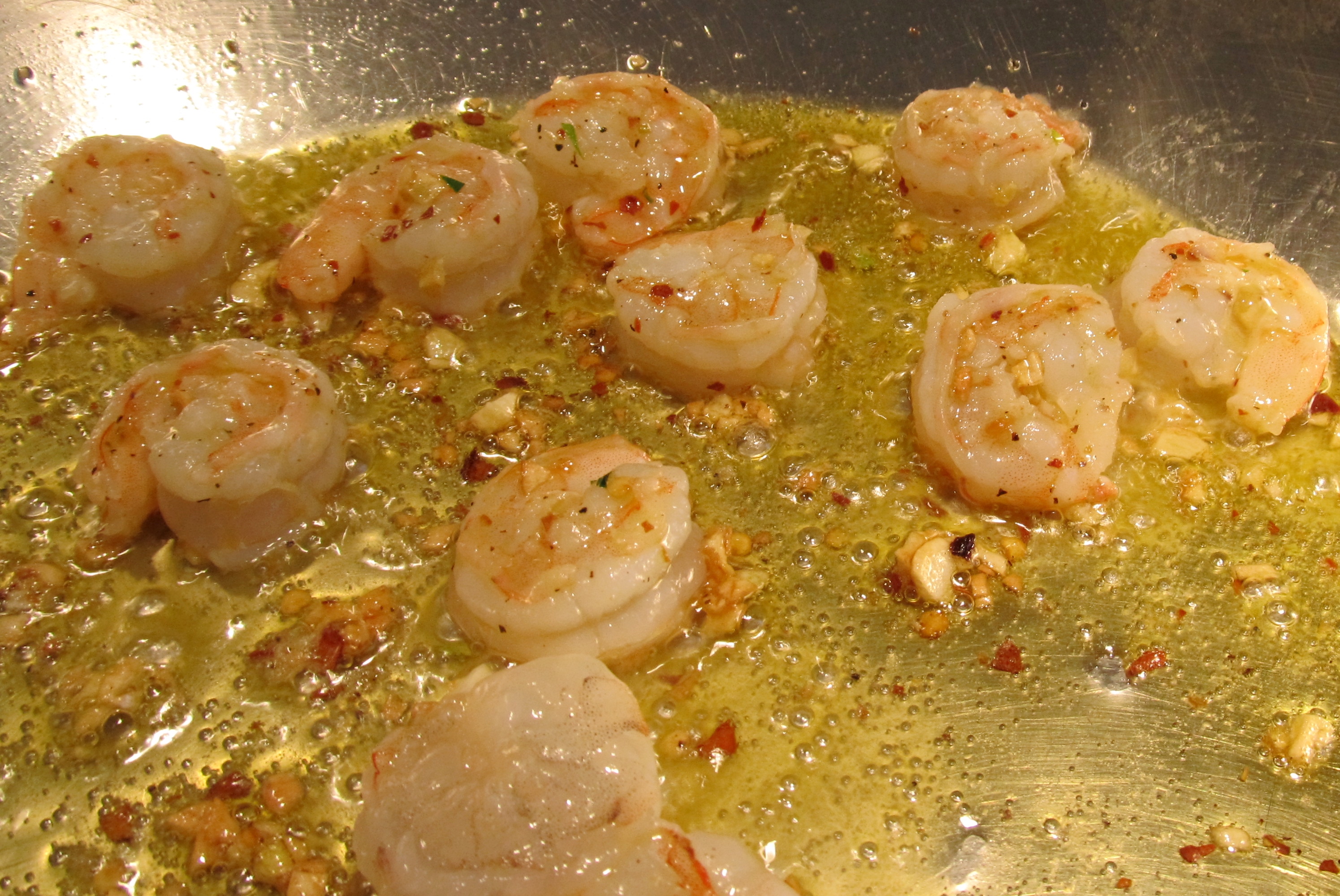 Warm oil in a fry pan. Add garlic and crushed red pepper. Once the garlic is wilted and about to turn golden, add the shrimp.