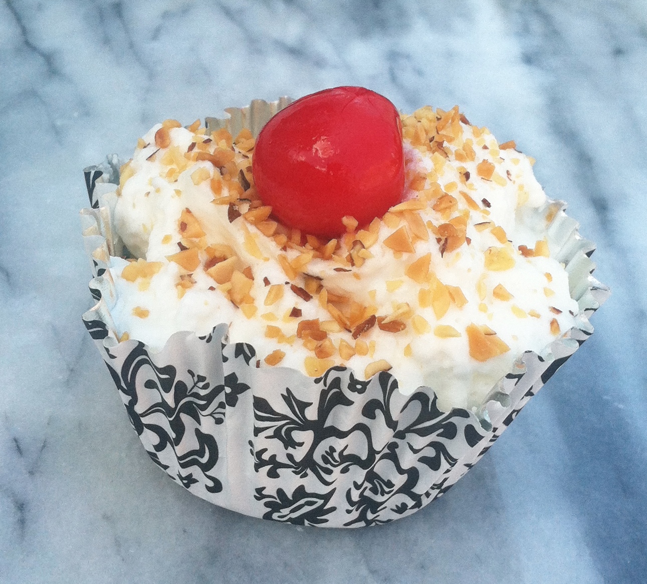 Place large dollops of cream mixture into paper liners in cupcake tray retrieved from freezer. Sprinkle with almond mixture. Top each with a maraschino cherry. Cover tray with foil. Freeze until firm (12-24 hours).