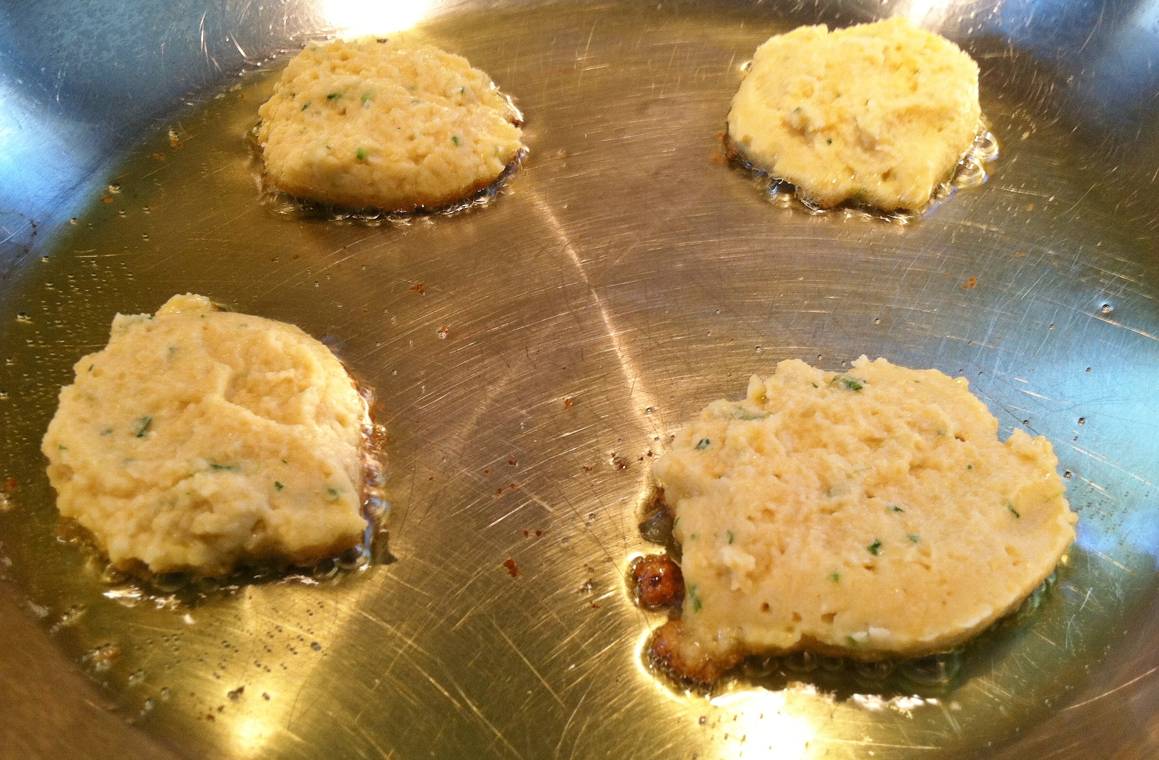 Heat a thin layer of olive oil in a large skillet to medium hot. Be careful the oil does not get brown or hot enough to smoke. Using a tablespoon, place a dollop of the mixture in the pan and flatten out with the back of the spoon to about ¼ inch in thickness. Cook for 3 minutes on medium to medium-low. Flip with a thin spatula and cook for an additional 3 minutes. Remove to paper towels.