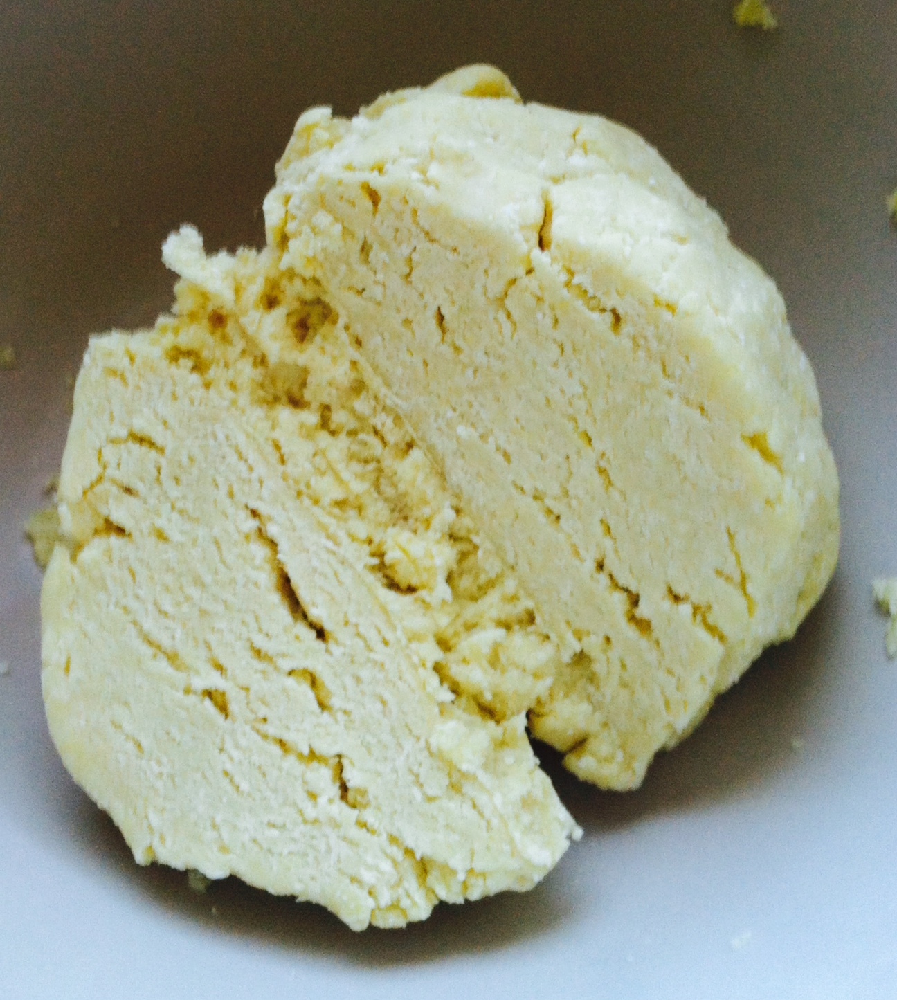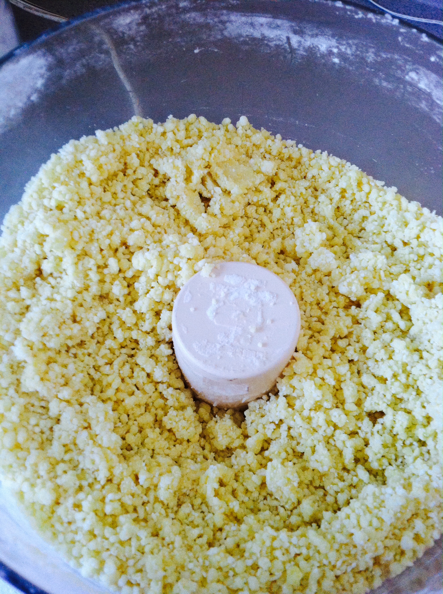 Add one egg at a time, pulsing between additions. The dough will be crumbly. Add 1-2 tablespoons of water, until dough is has tack but is not sticky.