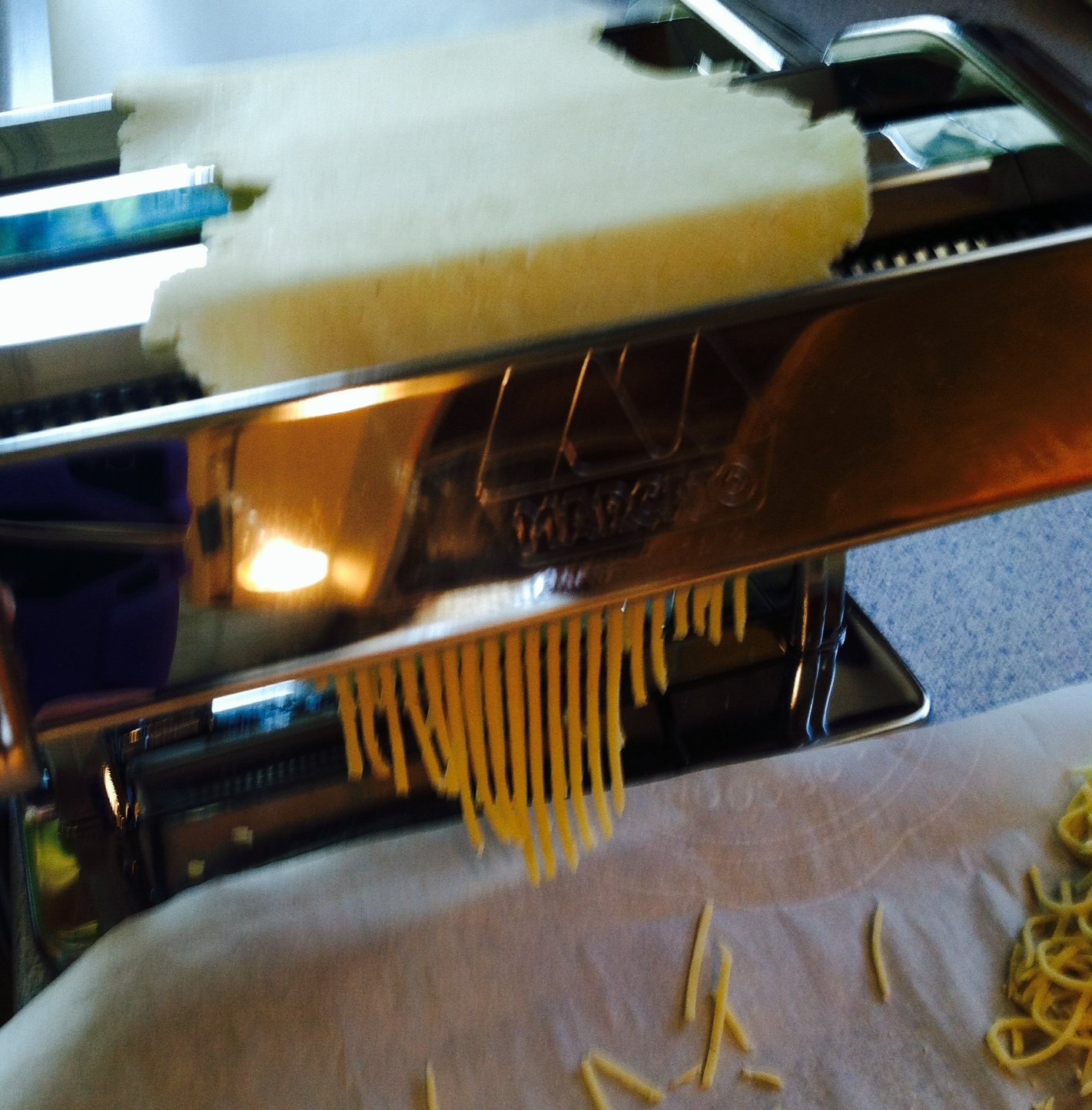 Assemble the pasta machine, place rollers on lowest (widest) setting. Prepare parchment paper on a clean table or cookie sheets for later use. Also place parchment on the counter beneath both ends of the machine.