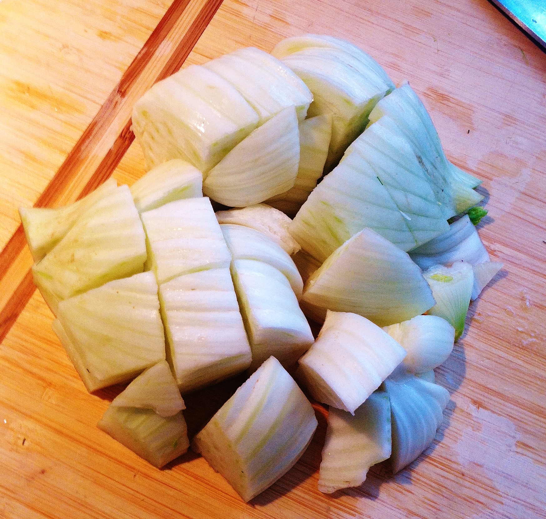 Prep the fennel bulbs: Cut off the leaves and the shoots, peel off the out damaged bulb layer and then roughly chop into large pieces. Preheat the oven to 370 degrees.