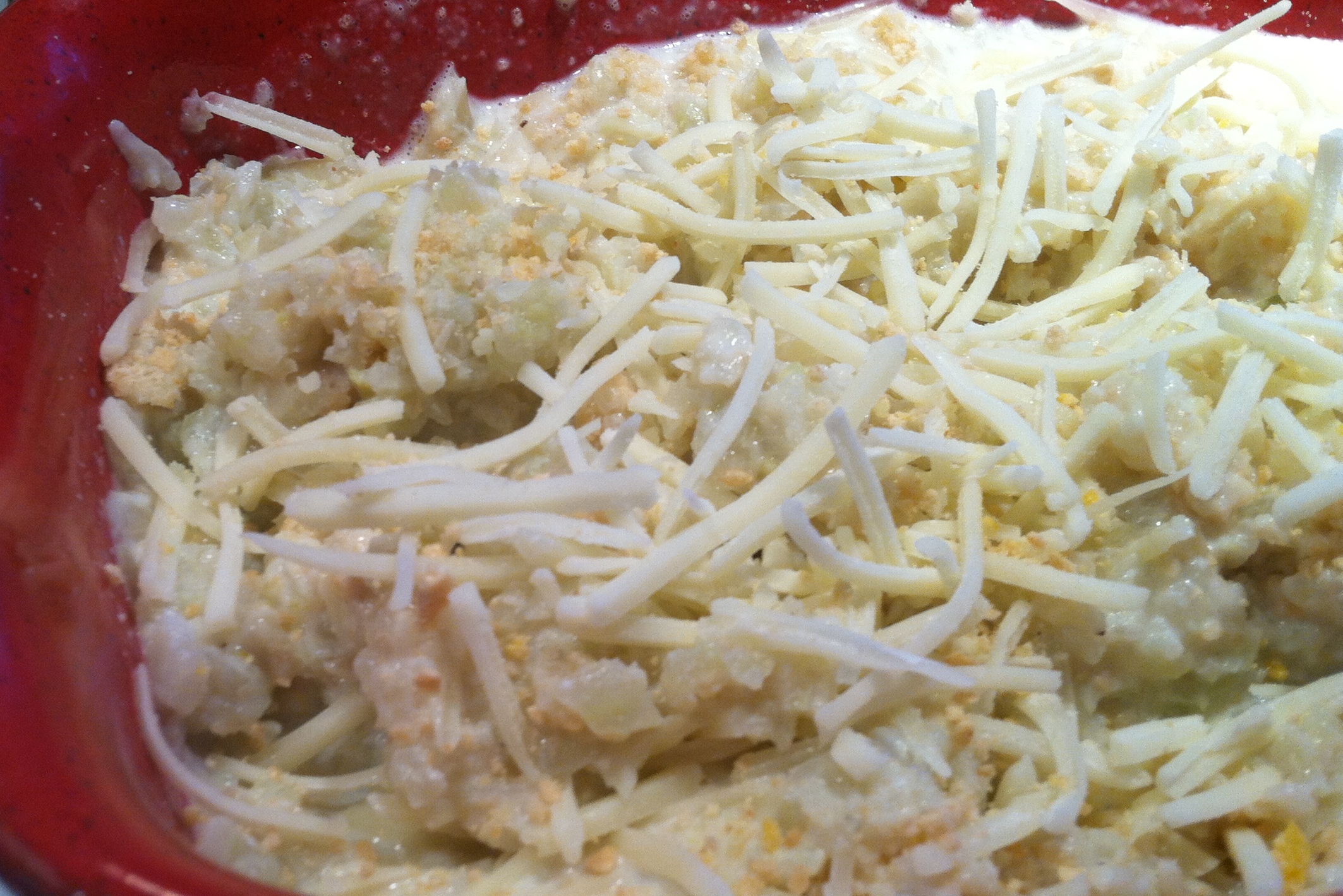 Add all of the cream sauce, followed by half of the shredded cheese, half the breadcrumb, then the remaining shredded cheese and the remaining breadcrumb.