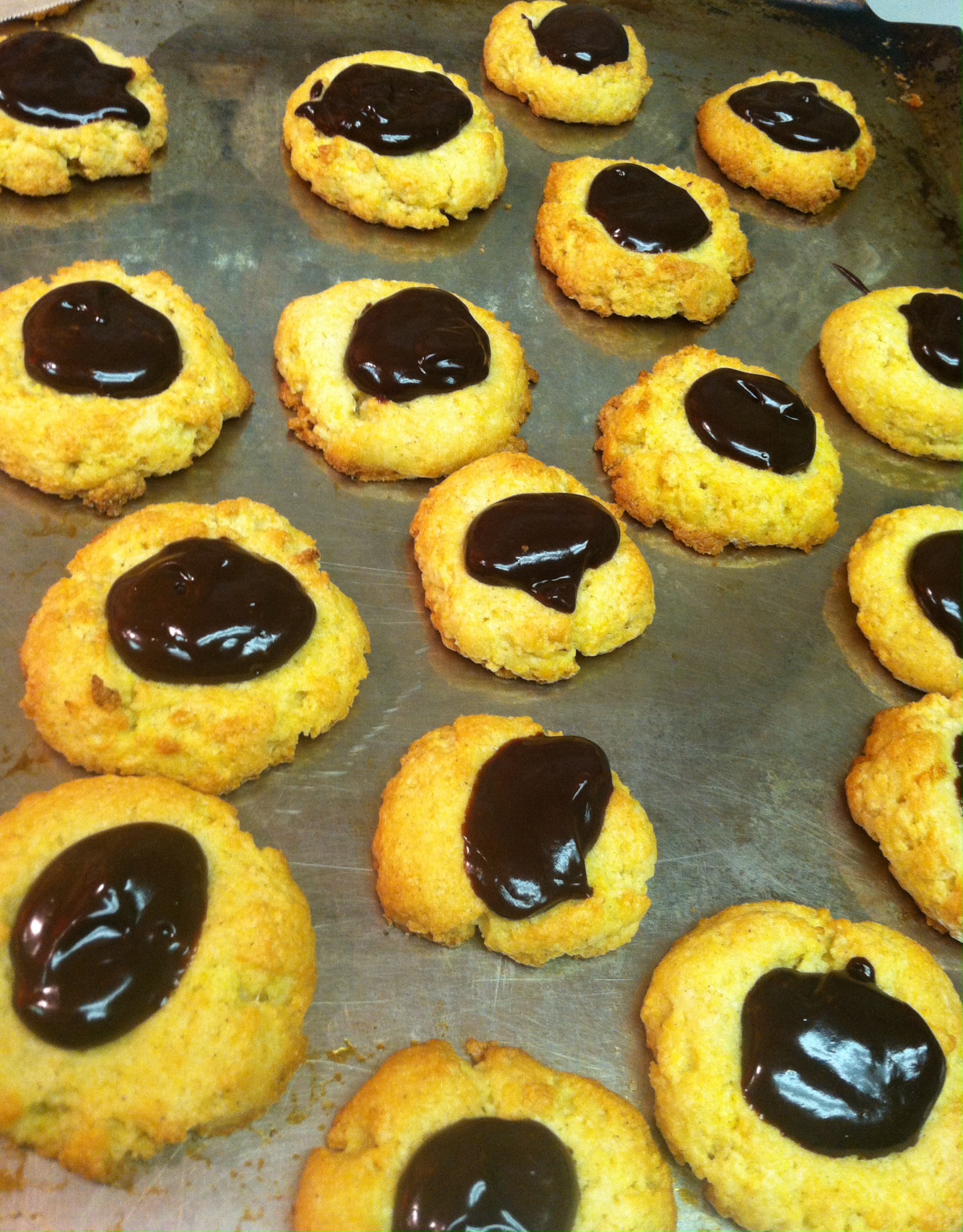Spoon approximately ½ teaspoon of melted chocolate into the center of each cookie.