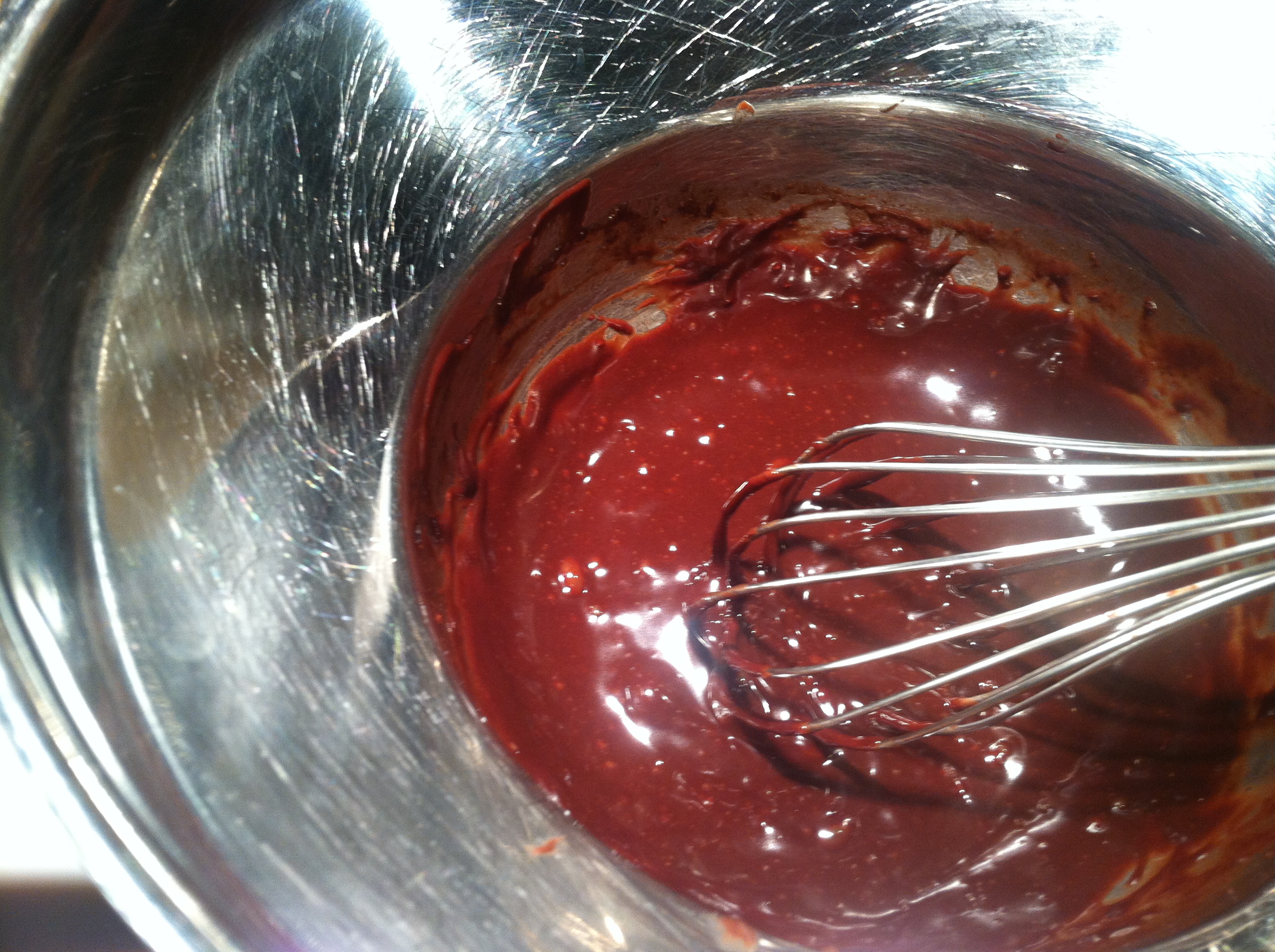 Melt the Chocolate: Place the butter and chocolate chips in top of double boiler. Once melted, add a splash of cream and whisk together.