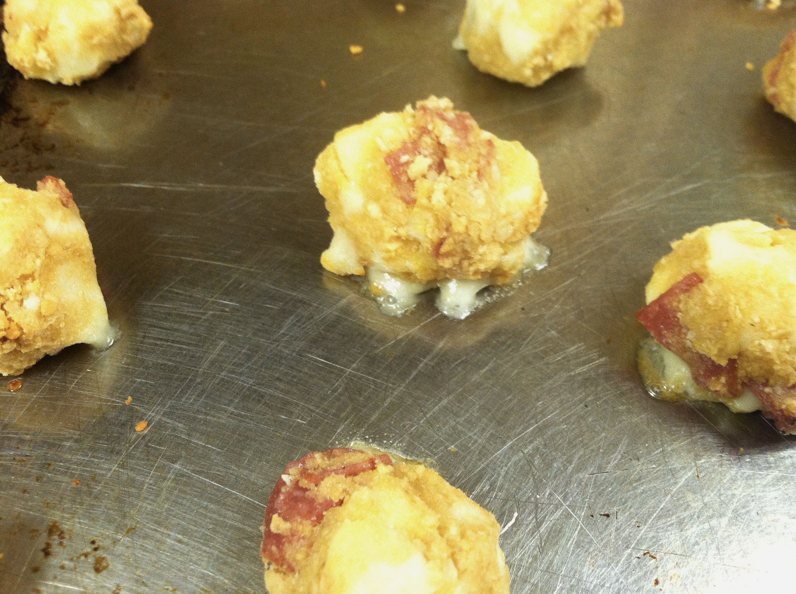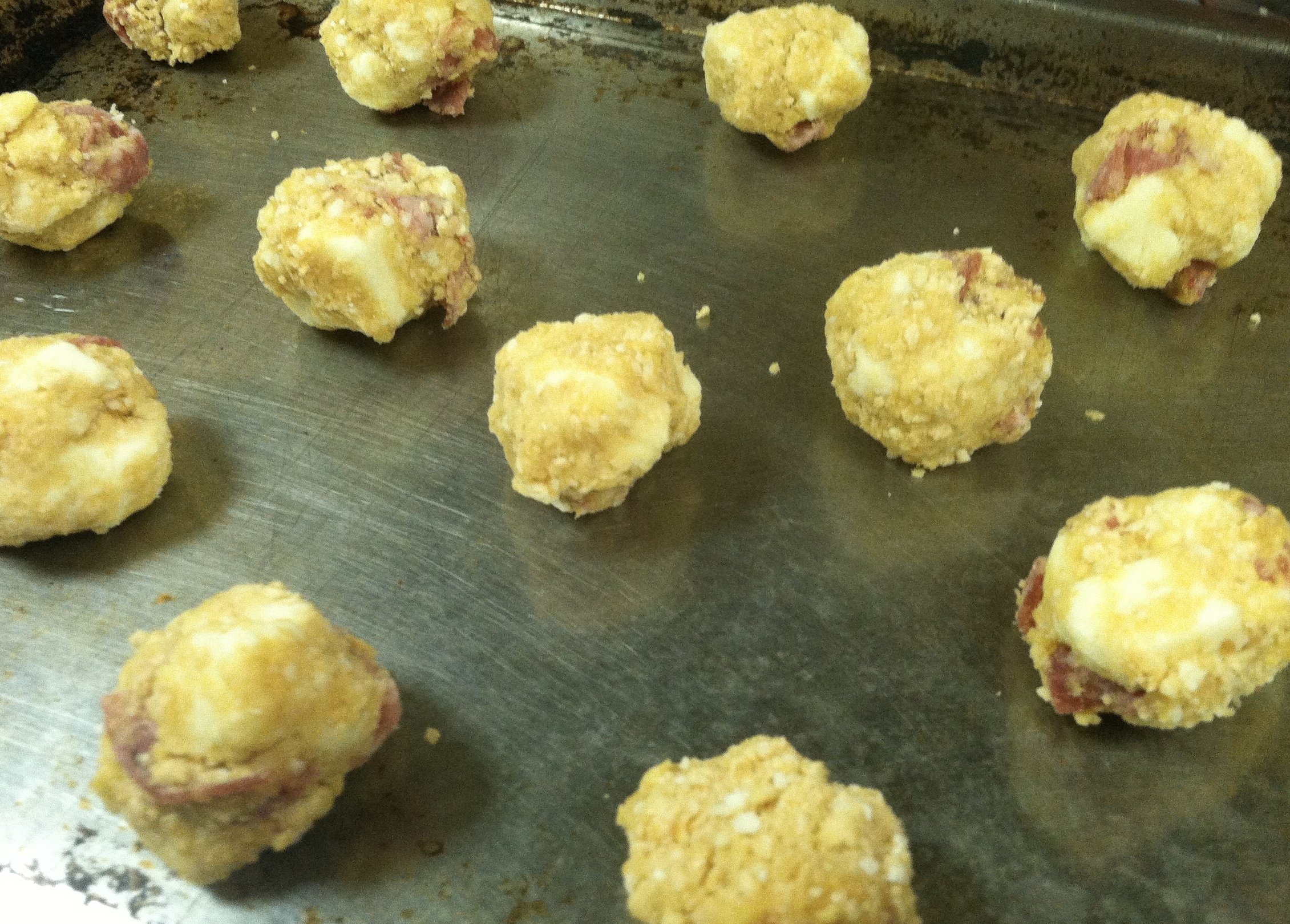 Pre-heat oven to 450 degrees; pluck a tablespoon of mixture and use the palms of your hands to create a ball, the ball should be no bigger than 1 ½”. Place on an ungreased cookie sheet. At least 2 inches apart. Bake for 6-7 minutes, until the bottom begins to melt and small bubbles appear. Remove to a plate and serve – these nibbles are wonderful out of the oven or room temperature.