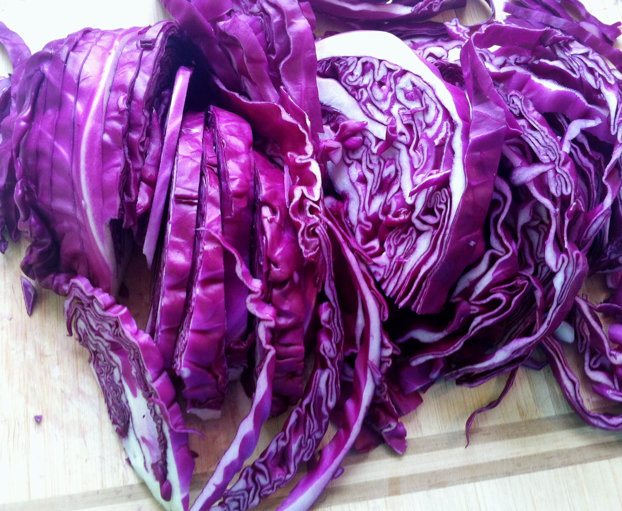Remove the hard outer leaves of the cabbage, cut in half and remove the core. Then Slice ¼ inch thick and loosely chop again.