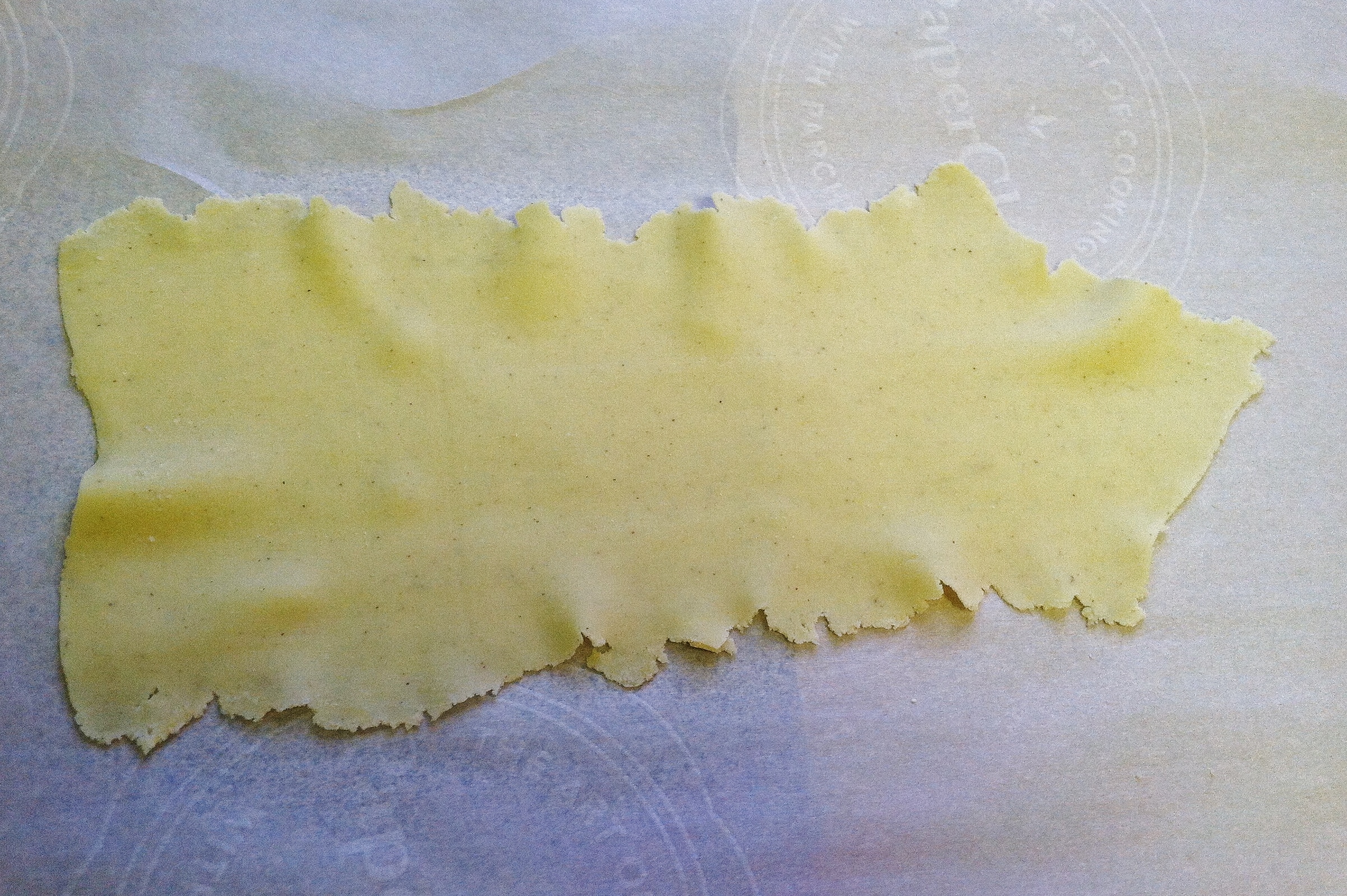 - Place the pasta sheet on parchment. Determine how many ravioli you will be able to cut. Each piece will need approximately three inches of space. Two inch clumps of dough will yield pasta sheets that are approximately 9” long x 2½ – 3” wide (roughly 3 ravioli).