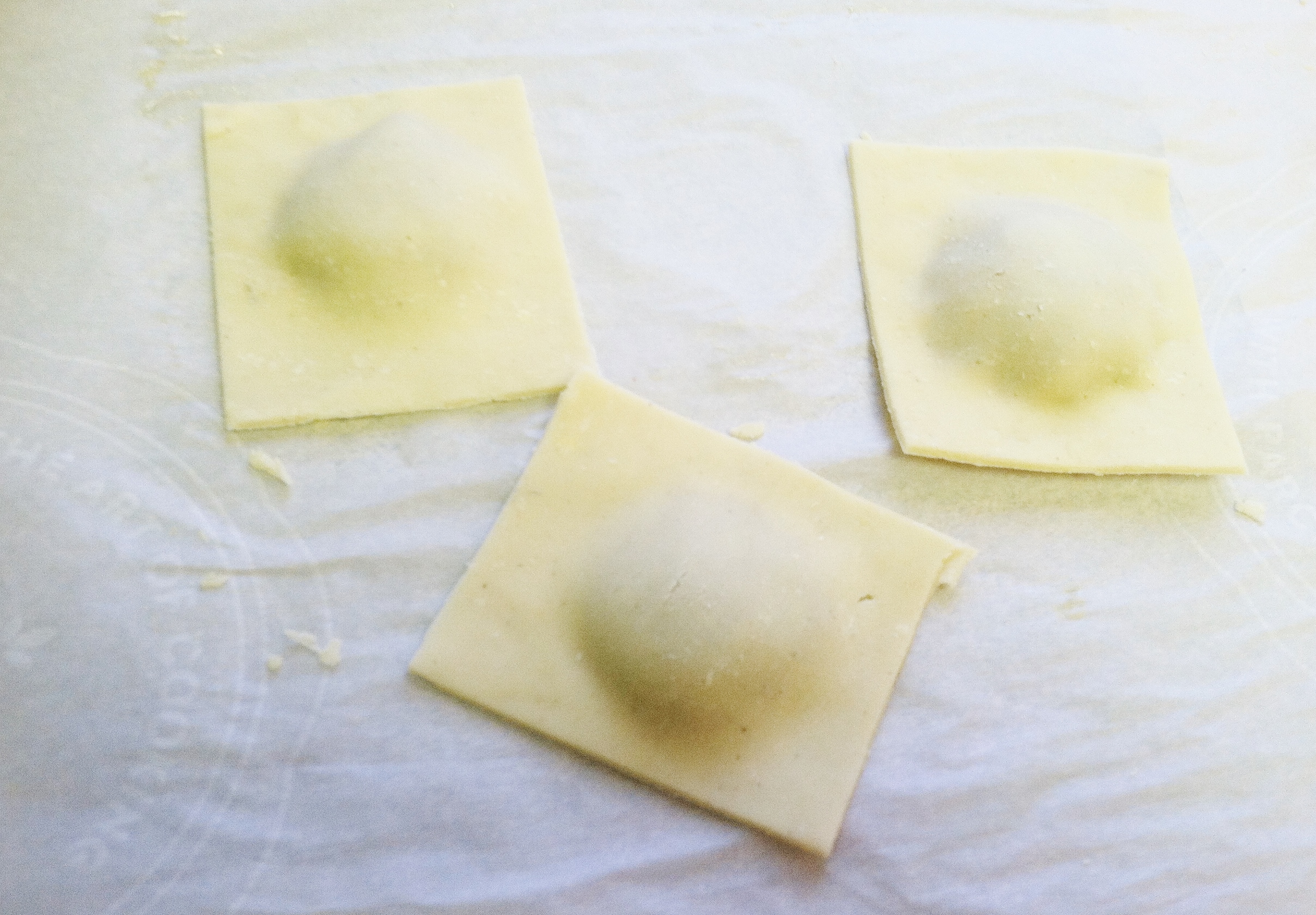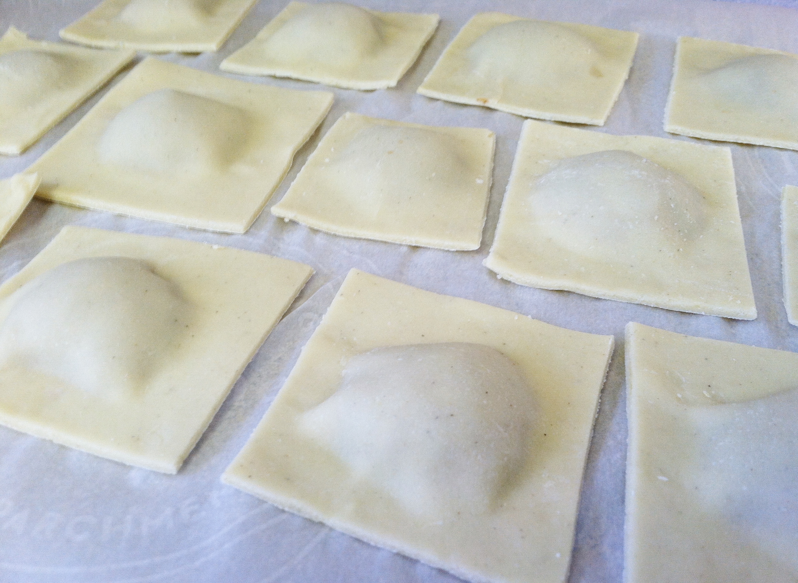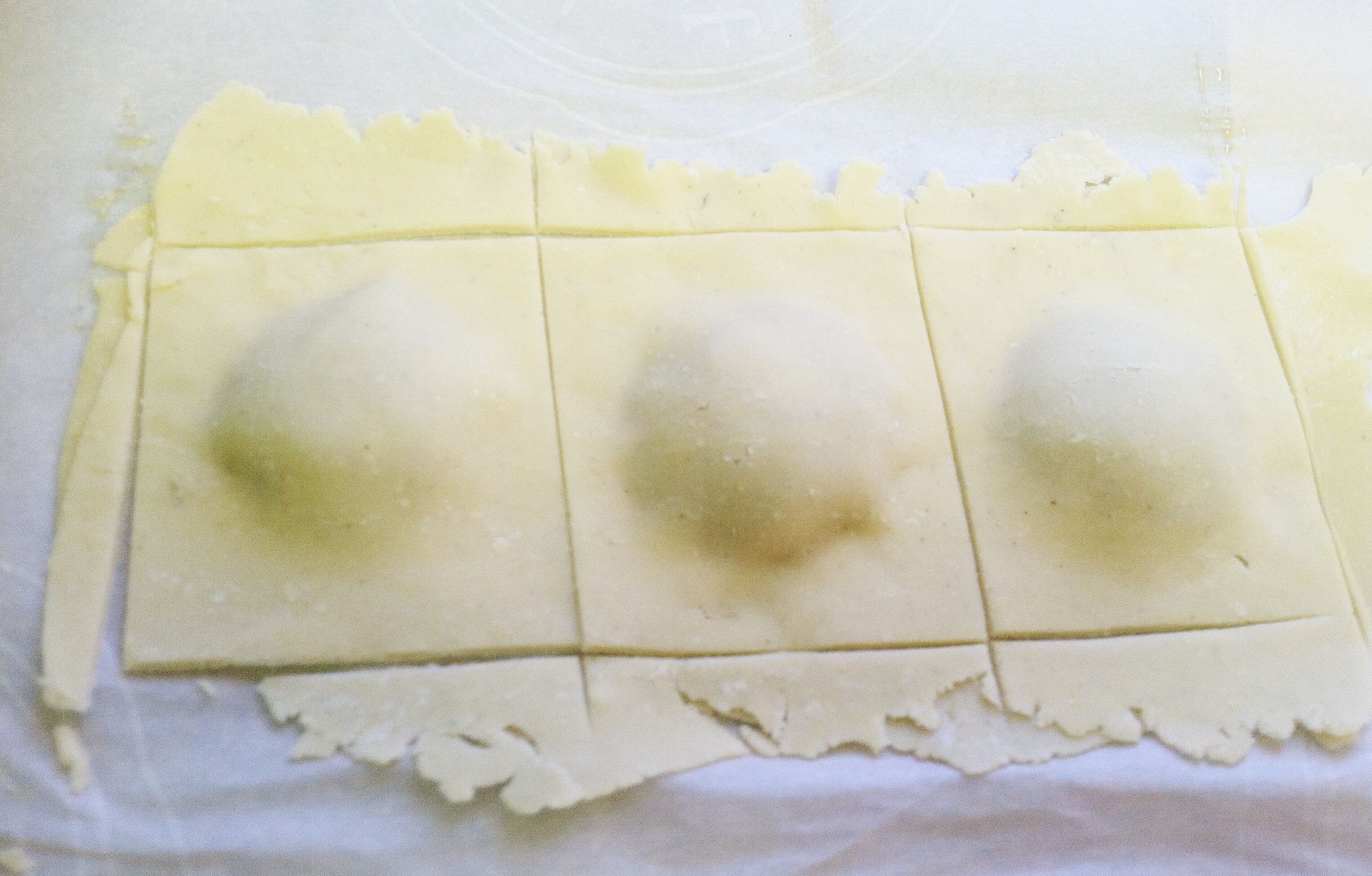 Making the Pasta Sheets: Follow the instruction of your pasta machine to create pasta sheets. Using the pasta machine: run each clump through the maker a few times. Make the sheet as thin as you can without it shredding, folding the sheets in half before the next pass usually circumvents this issue. You will use two sheets to make the ravioli. Place them on parchment. I make a few sets, then stuff and seal and then come back to the pasta sheets. I find this (as well as a bit of stretching every so often during the pasta prep day) helps battle repetitive motion stiffness in the neck and back the next day.