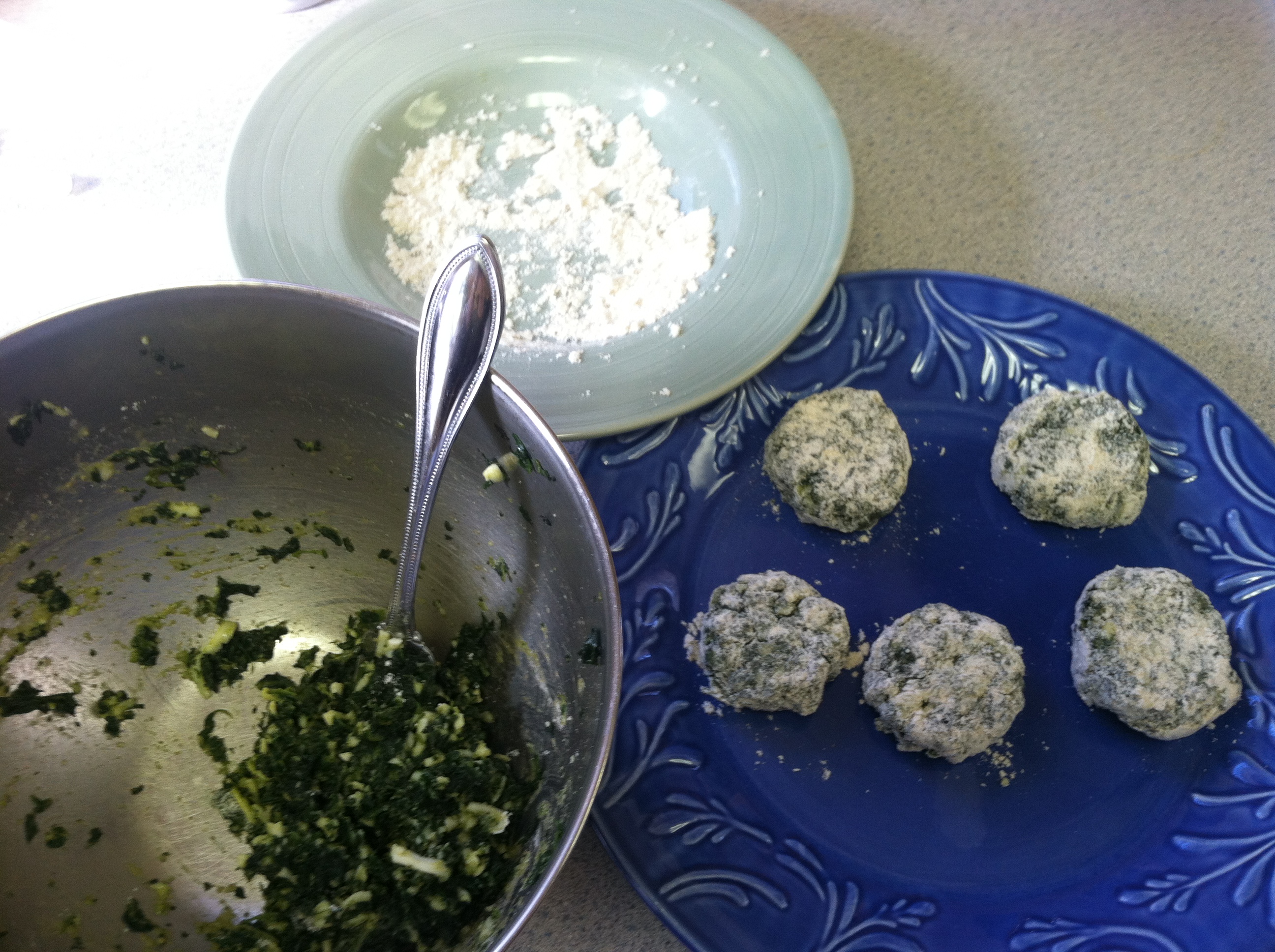 kitchen Wisdom Gluten Free Spinach Polpetti are delicious and moist appetizer. The spinach prep takes a bit of time but not a lot of labor. The key with this appetizer is to make sure the spinach is as dry as possible. The cheese balances the moisture when cooking. This recipe calls for shredded Fontina; however, mozzarella is a fine substitute if Fontina cheese is a challenge to find. I used potato starch and guar gum for binding and sorghum for bulk, flavor and increased protein content. Your friends and family will beg for more!