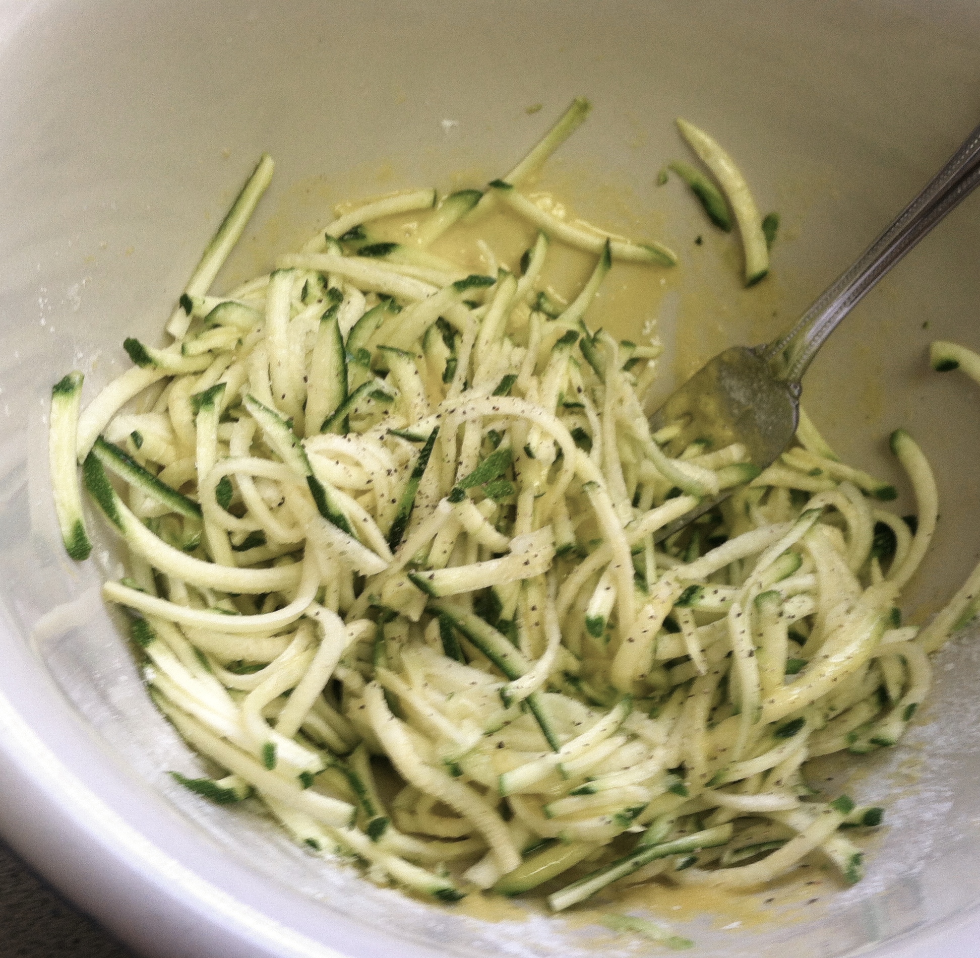 Pre-heat the oven to 400 degrees, either line a cookie sheet with parchment or oil the sheet and set it aside. In a small bowl whisk the brown rice flour and potato starch, set aside. Prep the zucchini: wash and cut off ends, shred or grate it in a food processor, sprinkle with a bit of salt and set aside.