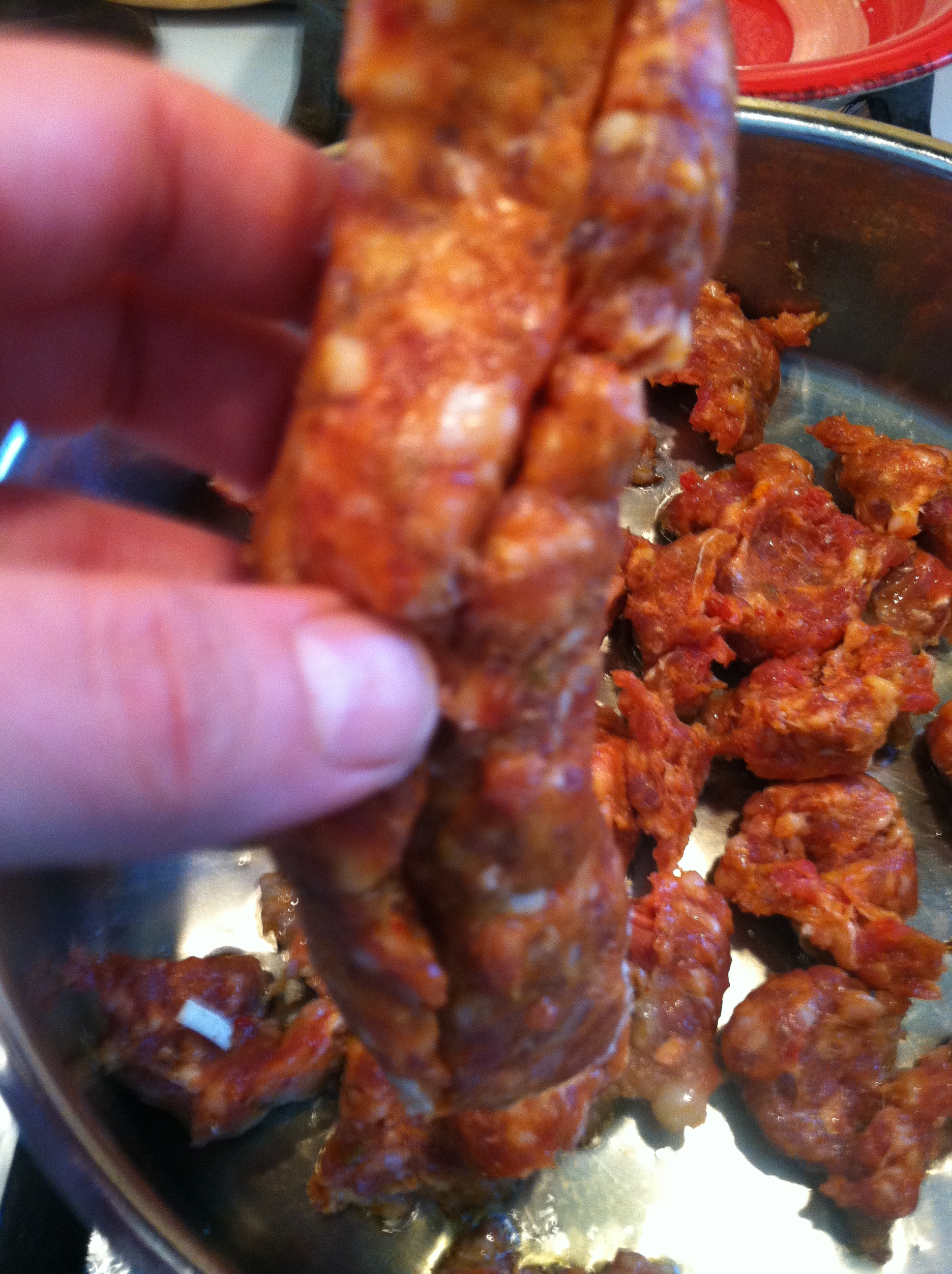 Chop the onion and set aside. Quarter the potatoes, slice the quarters in half and set aside. Prep the Sausage: Clean and remove the casing by slicing a vertical cut in the sausage from top to bottom. Discard the casing, separate the meat and place in an ample sized sauté pan to cook for 8 minutes on medium low.