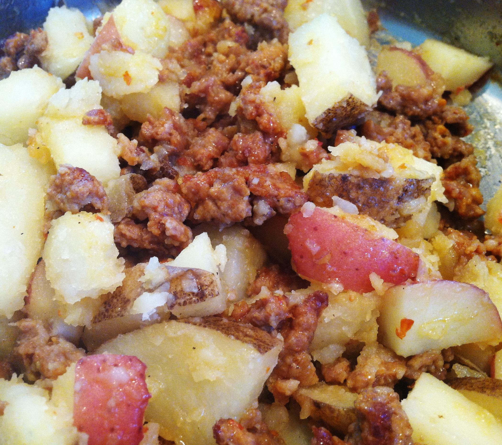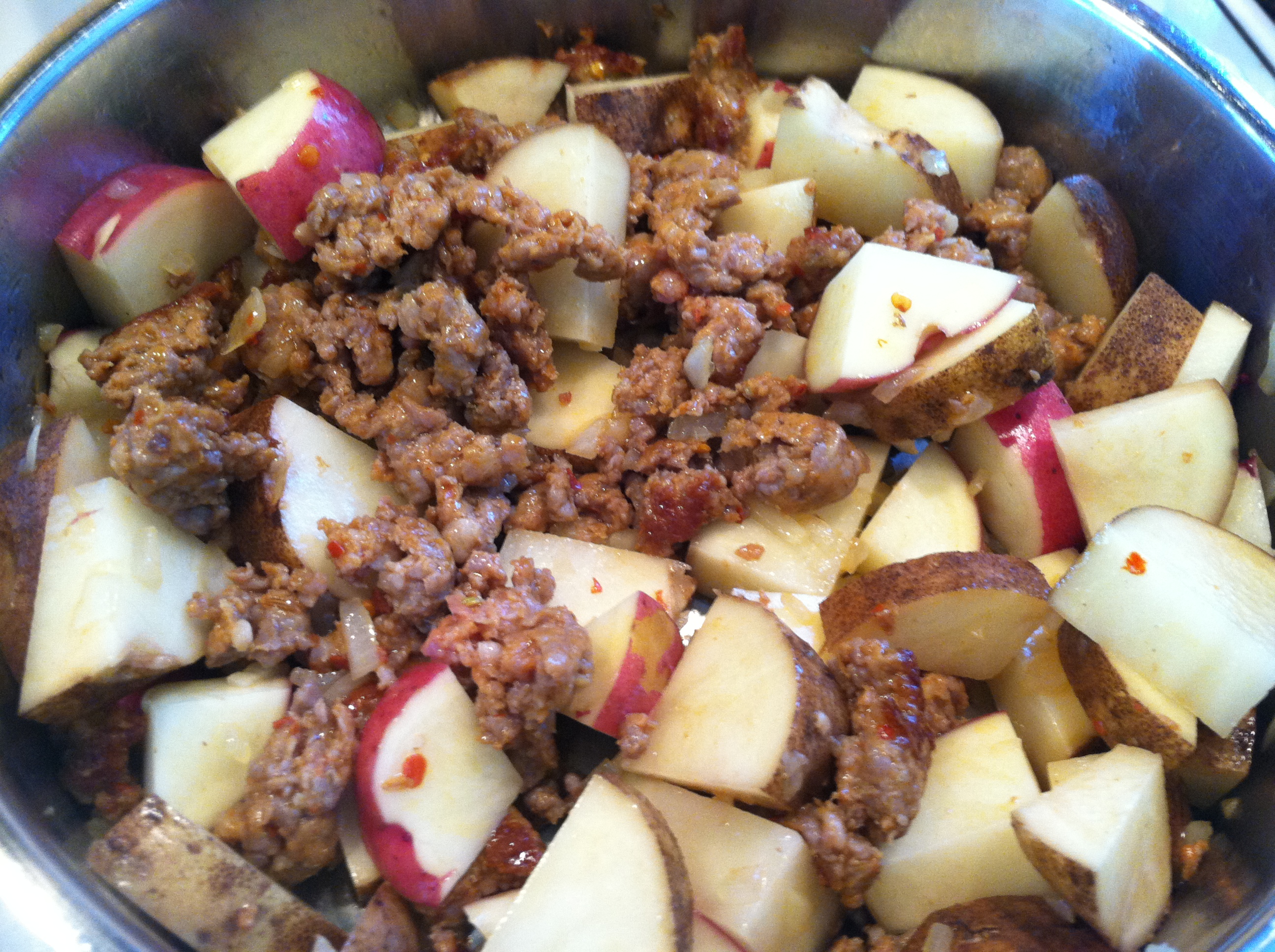 If the meat is lean you may need to add a dash of olive oil, if it is fatty, remove the sausage and drain the fat and then add the onion. Cook for an additional 5 minutes, add the potatoes and salt and pepper to taste. Toss all of the ingredients to completely combine. Place a lid on the pan in a slightly ajar position, and cook for 30 minutes, toss every ten minutes during cooking time.