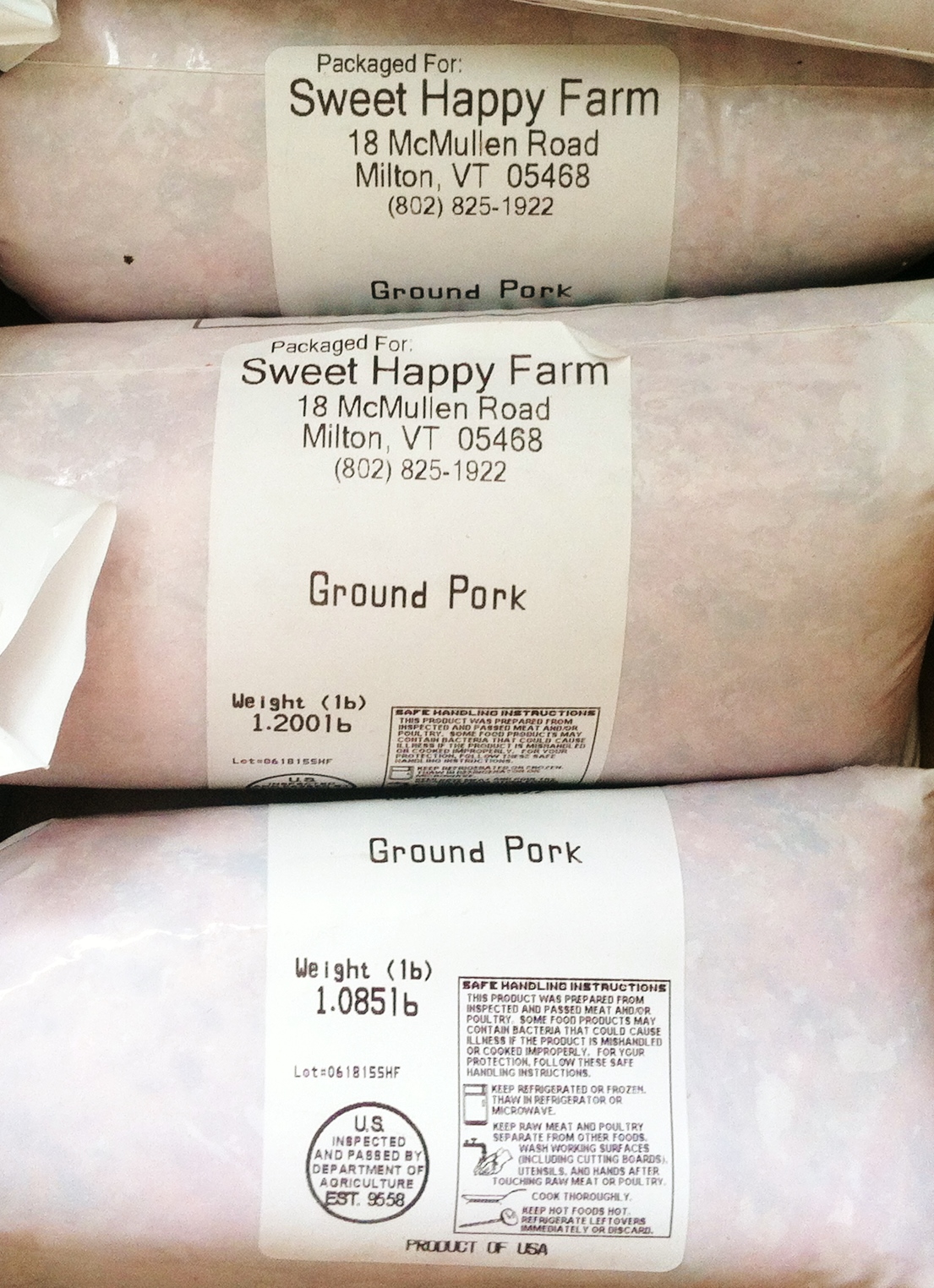 What are the Sweet Happy Farms Pork Products? Naturally Cured Bacon and Ham Steak, Pork Chops, Italian Sausage without casing, Sage Sausage without casing, Backfat and Ground Pork. However, supplies are limited and when a product is sold out you may have to wait a while for it to return!