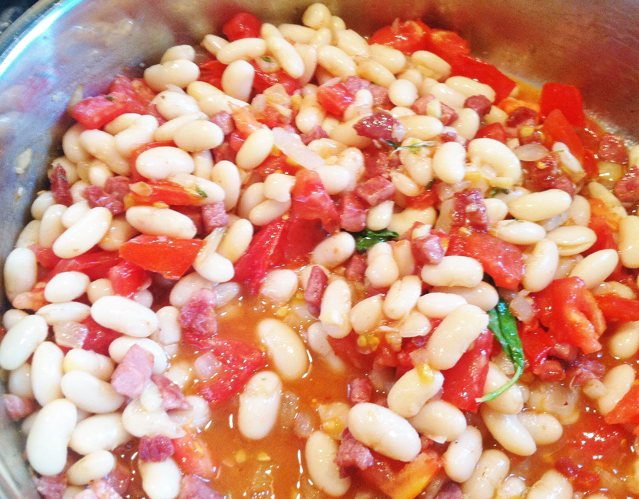 There are so many southern Italian and European country bean recipes; this is a variation on a cannellini bean dish my cousins used to make. This Kitchen Wisdom Gluten Free Summer Cannellini Beans recipe traditionally uses Pancetta, Italian cured pork, sometimes referred to as “Italian Bacon.” I have difficulty getting genuine tasting Pancetta and prefer the dish have uncompromised boldness of flavor. So, I substitute Pancetta with locally cured pork instead. In this Kitchen Wisdom Gluten Free Summer Cannellini Bean recipe, I use naturally cured Ham Steak from Sweet Happy Farms in Milton, VT.