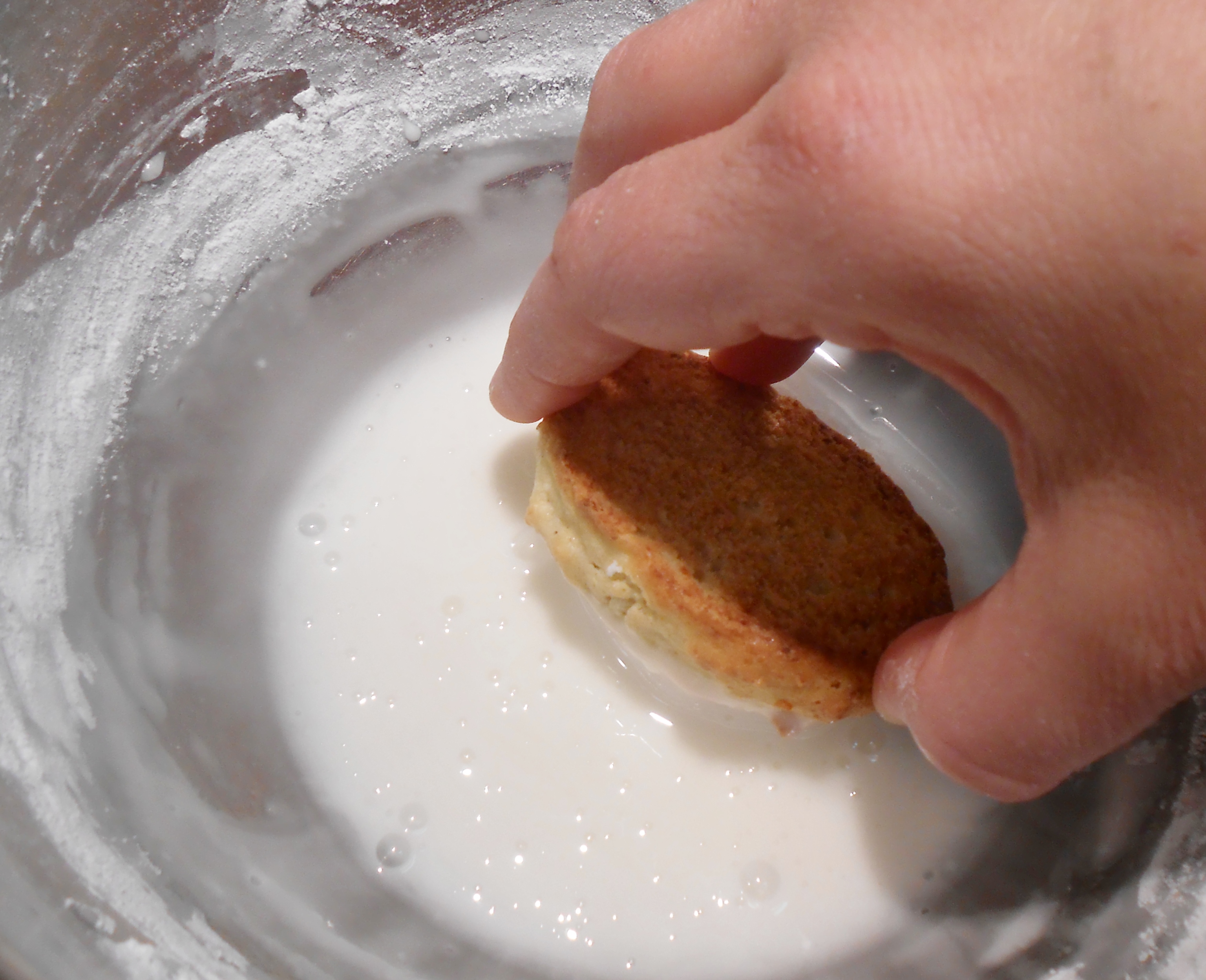 To Dip the Cookies: Using a quick motion, gently dip the top of the cookie in the icing bowl, using a circular motion with your wrist so the entire top surface of the cookie is covered.