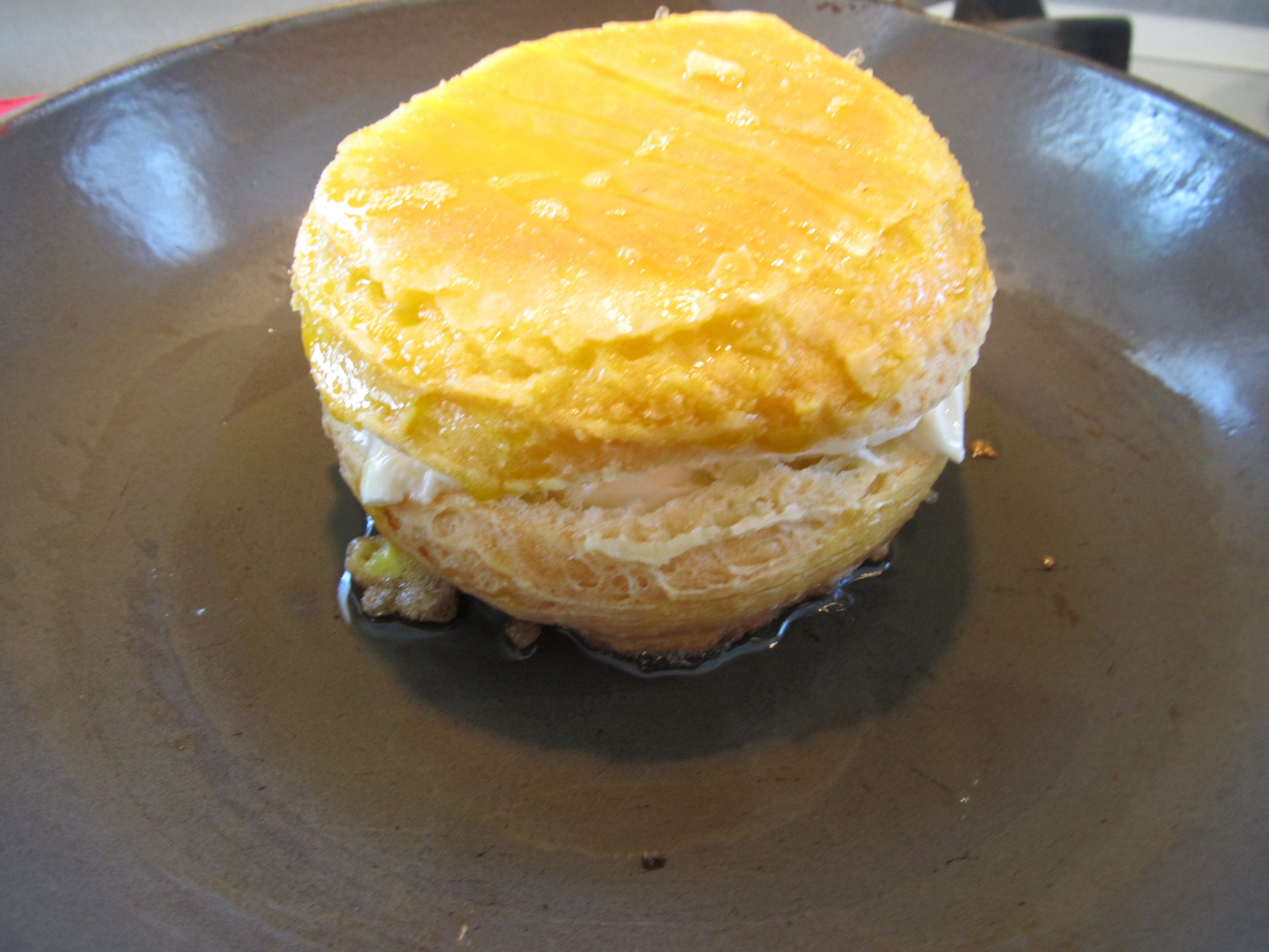 Warm a heavy bottomed fry pan on medium heat. Add two teaspoons of olive oil, allow the oil to heat up for a few moments. Place one half of the roll, egg bathed side down, in the hot oil.