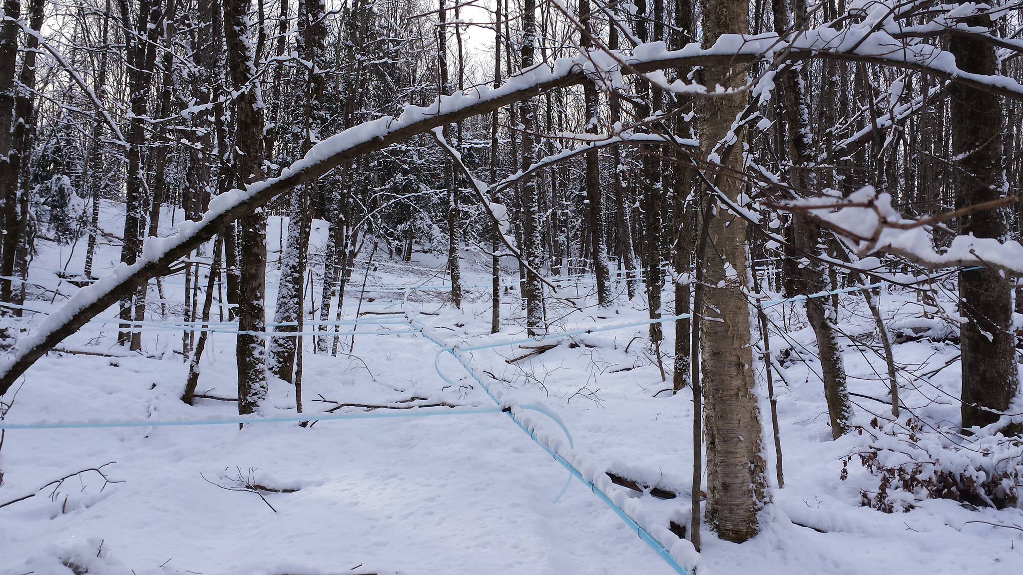 Potter Family Maple has 1800 Maple trees on 54 acres in one location, and an additional 600 trees in another. They are currently expanding to 3000 taps on the 54 acre parcel. This year they added 200 taps on a new line and used 5000 feet of blue tubing to accomplish the expansion. The line hangs on a wire system which is run through the woods and the rest ties into the mainline tubing and ultimately into the system to be ready for boiling.