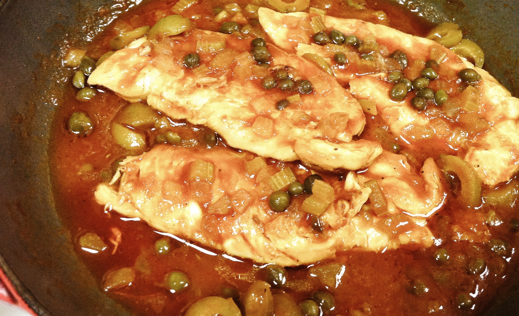 Return the chicken to the pan, completely coat with the liquid, cover the pan. Simmer on low and cook for approximately 25 minutes (until the chicken is incredibly tender). Mix in the olives and simmer another 3 minutes. Allow to stand in the covered pan for at least 15 minutes before serving. Enjoy!