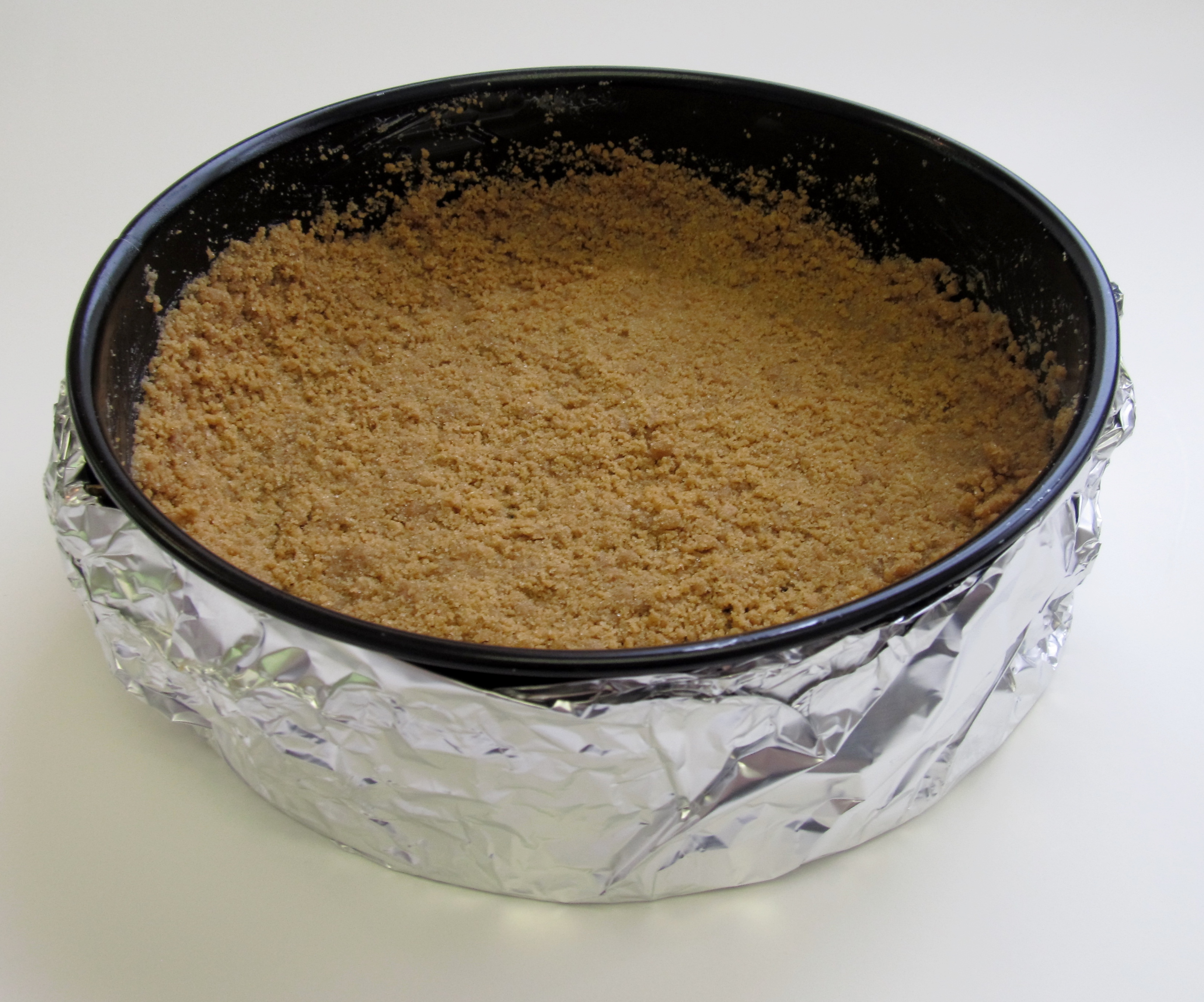 Assemble Crust: These layers need to be water tight. Dump crumbs into spring form pan, use your hand to press crumbs down into place at the bottom and traveling about halfway up the inner side of the pan.