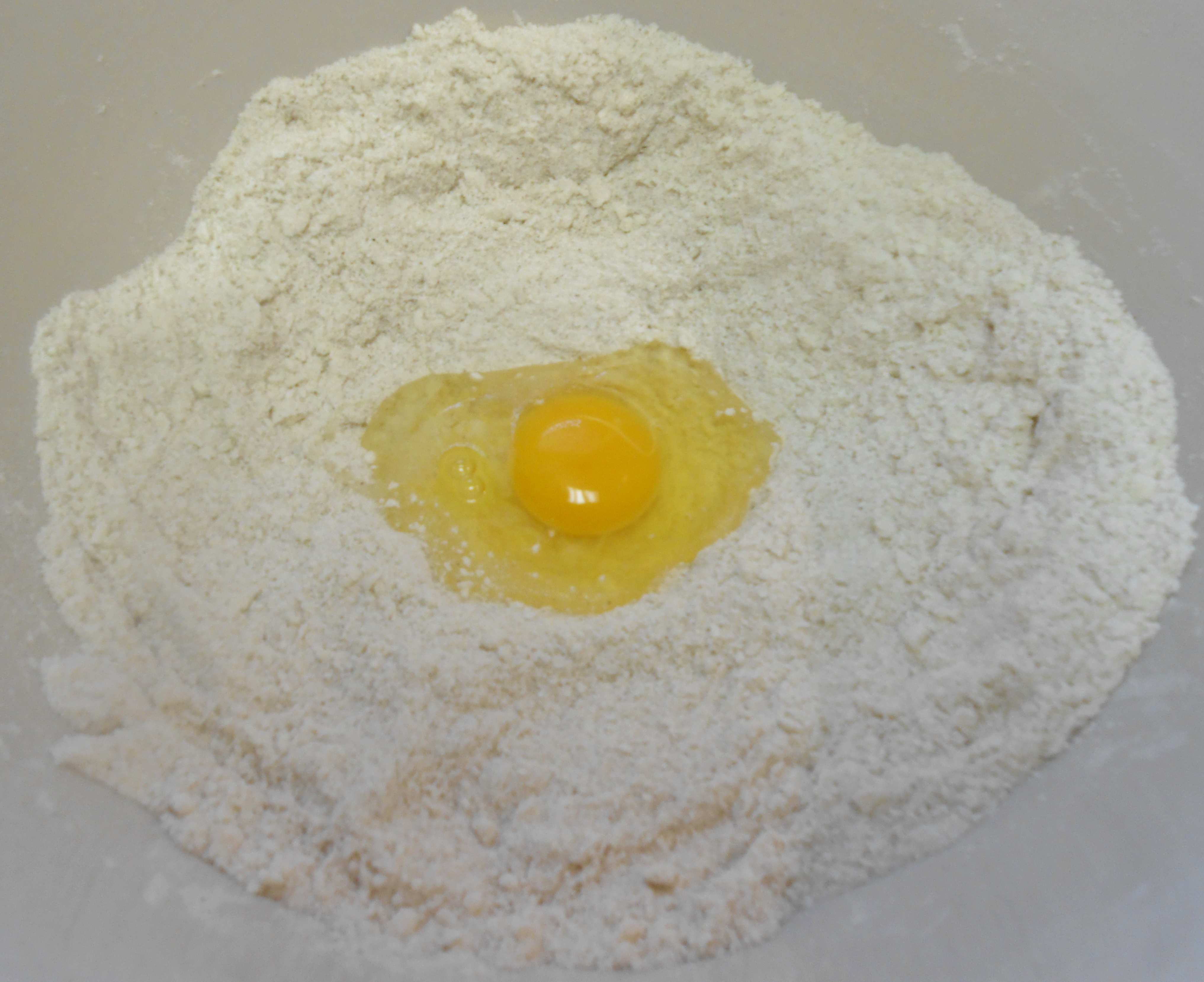 Make a well in the flour. Add one egg, blend and combine thoroughly. Repeat this process until you have added all four eggs.