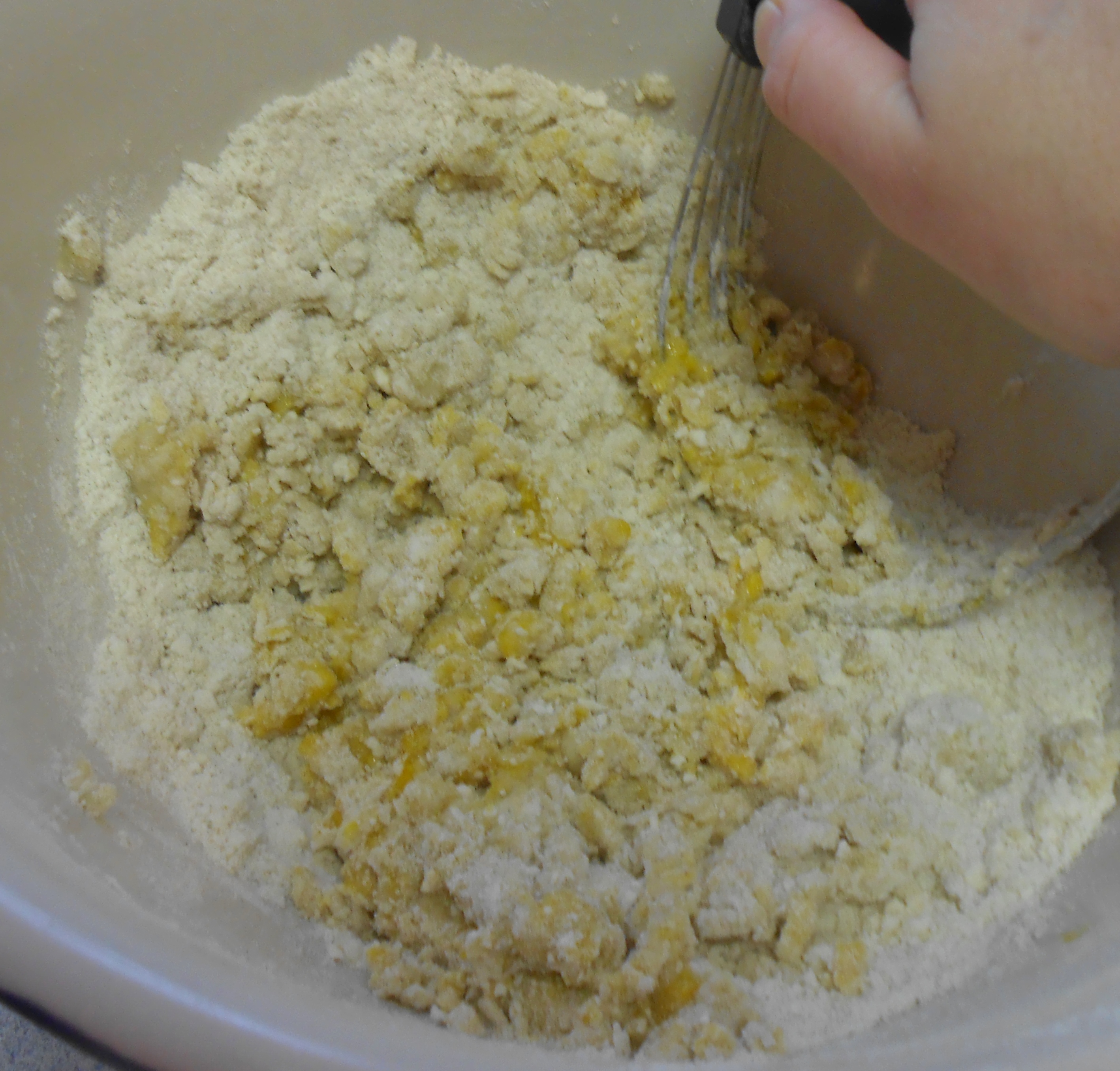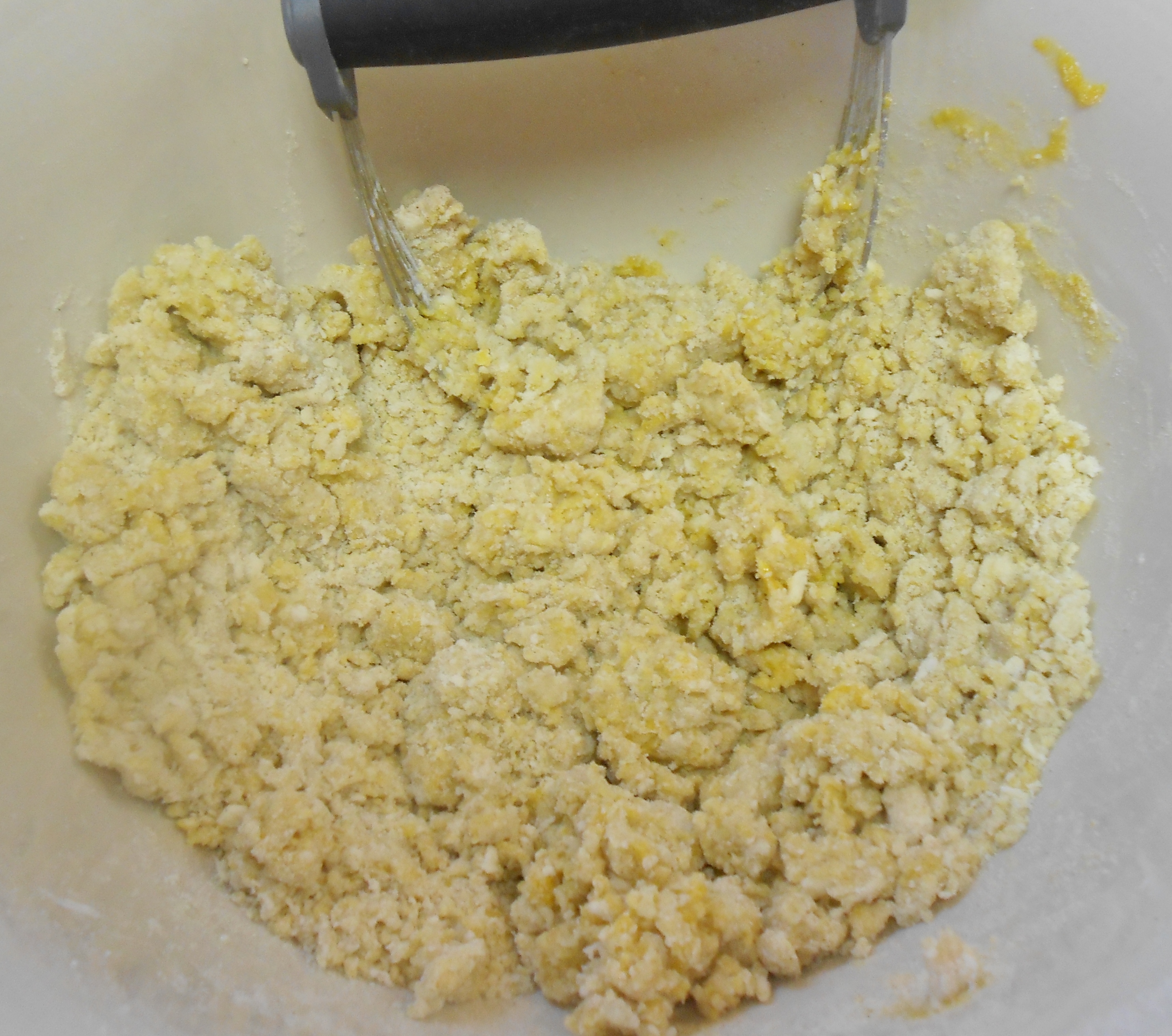 Sift all of the dry ingredients together in a large mixing bowl. Cube cold butter into smaller and manageable pieces, set aside for a moment. Using a pastry blender aerate the flour and whisk in sugar – one tablespoon at a time. With the pastry blender “cut” in the cold butter, a few pieces at a time. Blend and stomp with the blender, keep a butter knife on hand to periodically scrape batter of the tines of the blender. Do this until the flour is a pebbly texture.