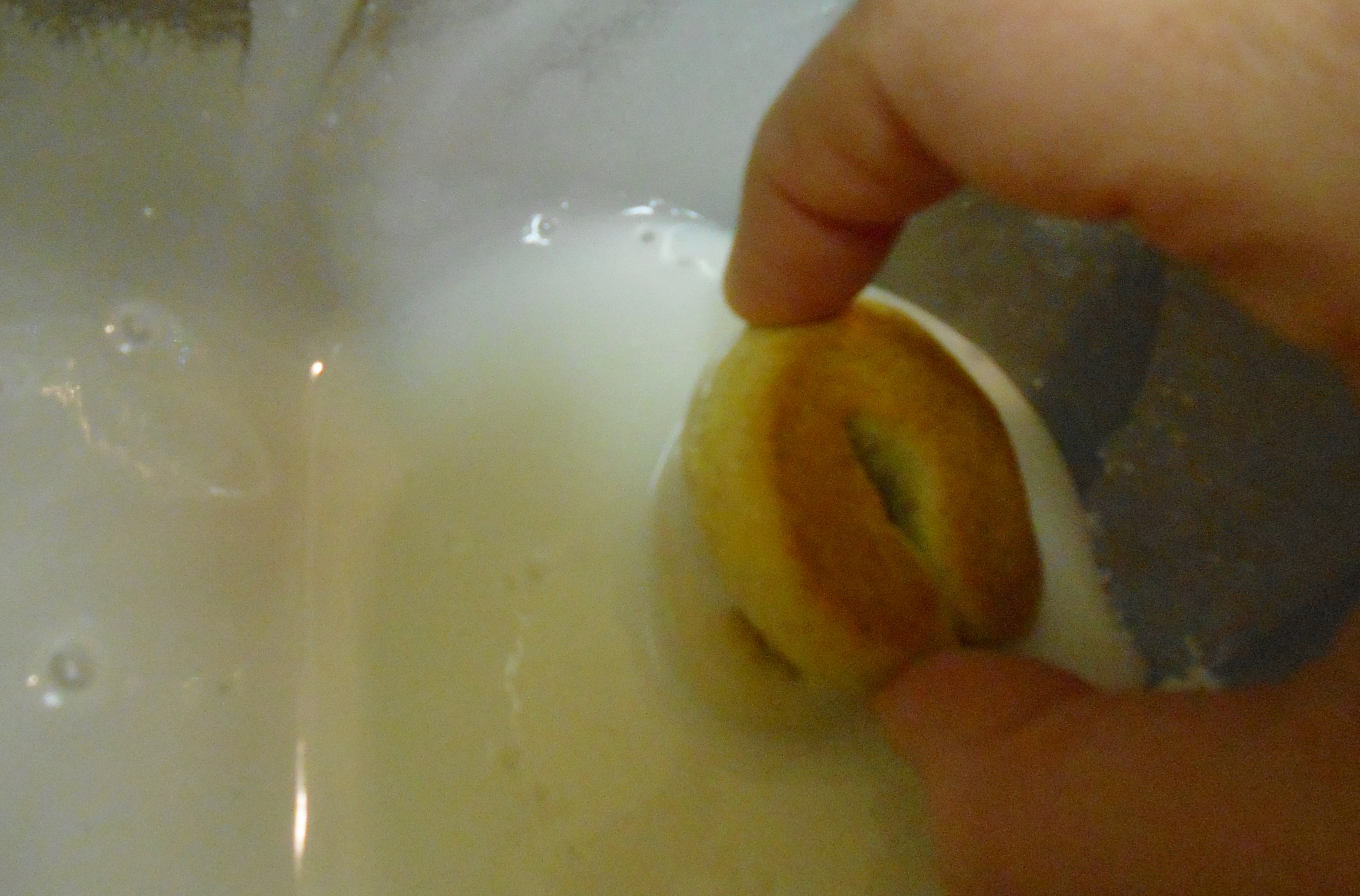 In a small bowl that you can manage with one hand, vigorously whisk together 2/3 cup confectioner’s sugar and add 1 teaspoon of Anise extract, whisk thoroughly to coat sugar. Then add 2 teaspoons of milk, followed by 1 additional teaspoon of milk. Then add an additional teaspoon of milk and frantically whisk again, being sure to create a smooth icing. If the icing is too thin it will run loose and dry very clear.