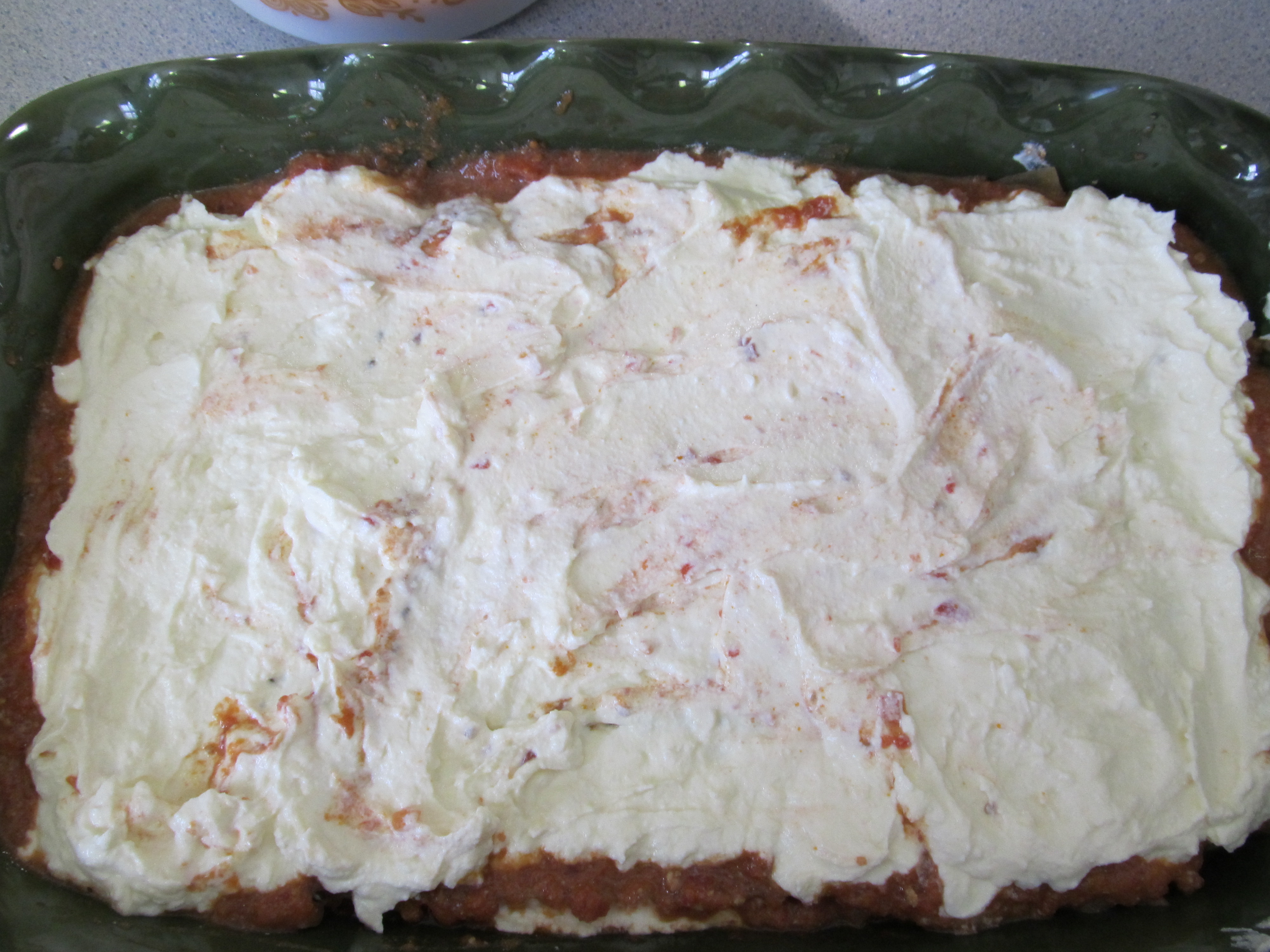 over the sauce layer, being sure again to get the cheese to the ends of the pan.