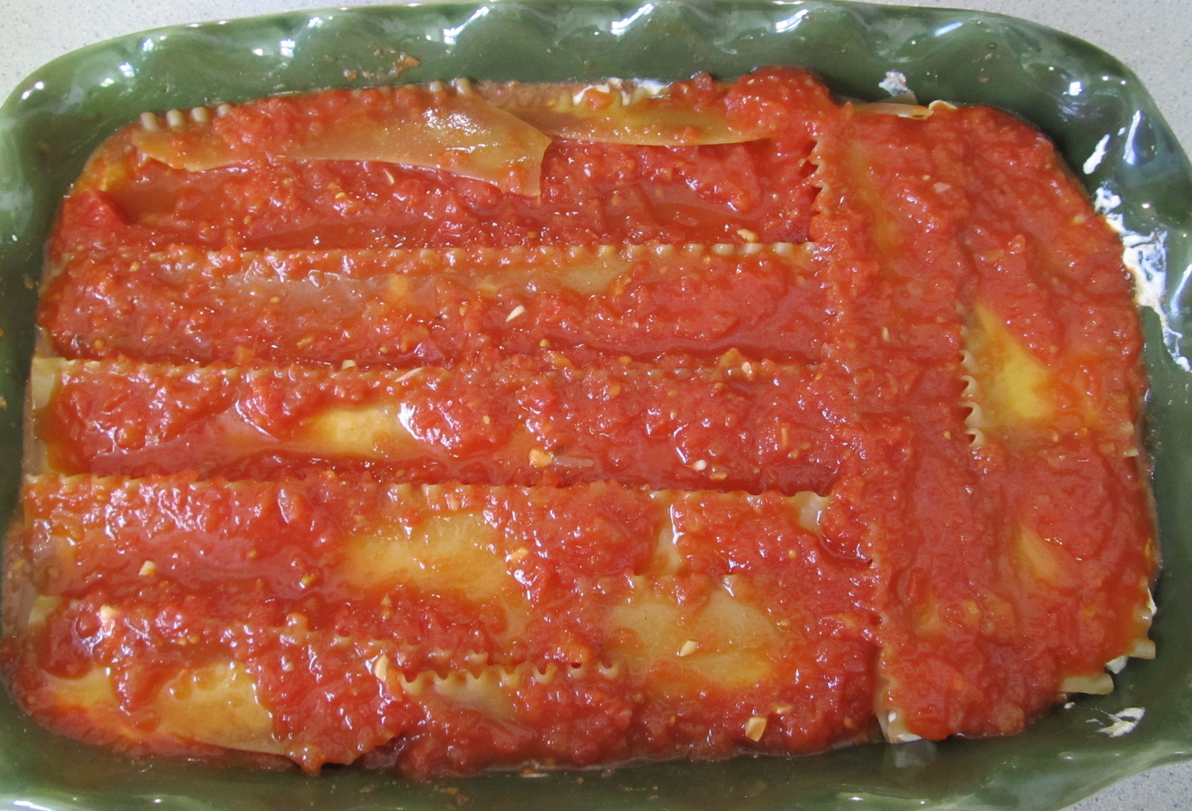 Place another layer of lasagna pasta over ricotta mixture. Break pasta with hand to make the correct size. Stuff broken pieces of pasta at ends, sides and corners, covering the entire surface. I place the second layer end in a different direction than the first. I find this makes the pasta hold even better shape for serving.