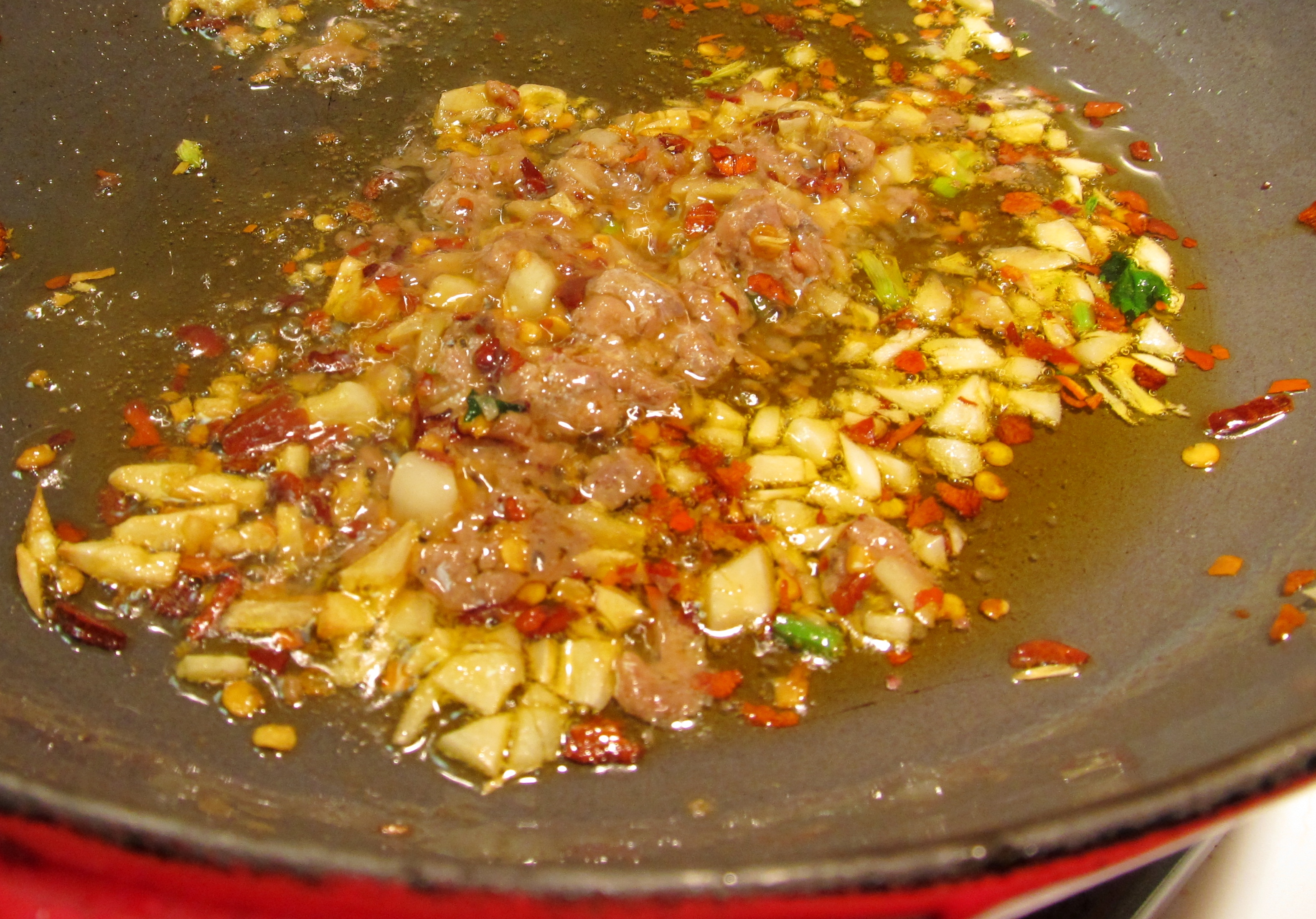 Sauté garlic & crushed red pepper in olive oil in a sauté pan. I like it hot – do you like it hot? Add the crushed red pepper to the oil at the start infuses the oil with the chili and the heat.