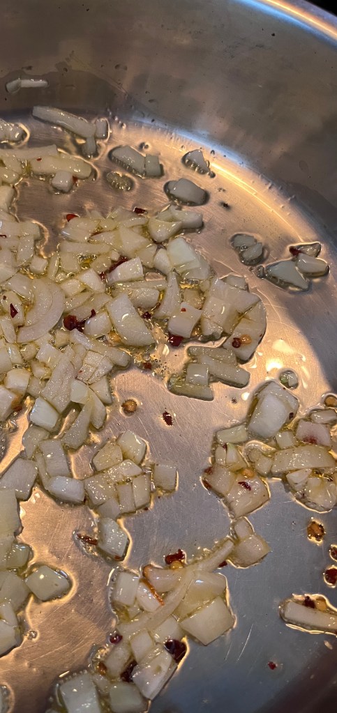 First, make a Sofrito (cooking base): use olive oil warmed – add onion, a moment. Then add Garlic, continue to sauté, add crushed basil.